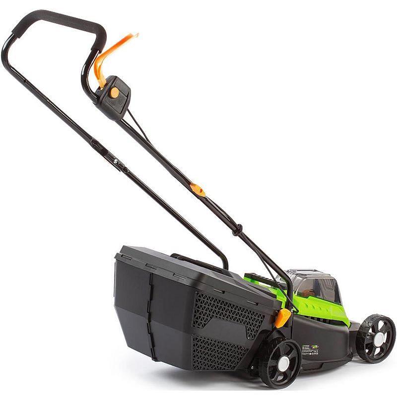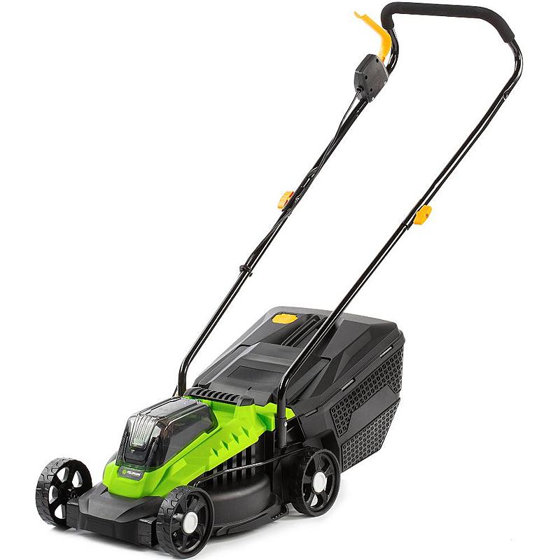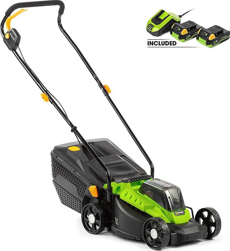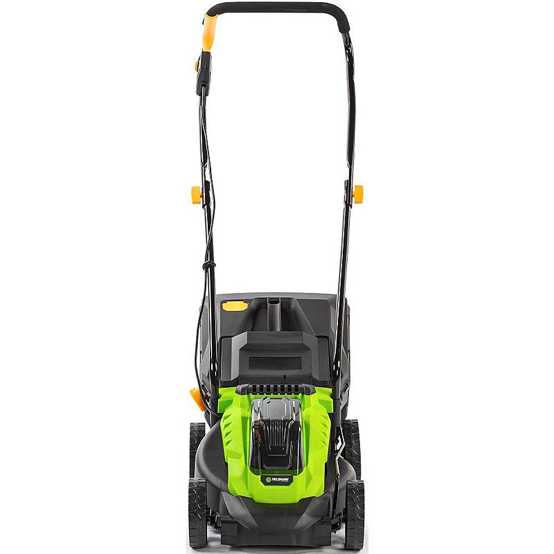 Akumulátorová sekačka na trávu Fieldmann se šířkou záběru 33 cm, objemem sběrného koše 35 l a 6 polohami výšky sečení. V sadě se dvěma akumulátory a nabíječkou.