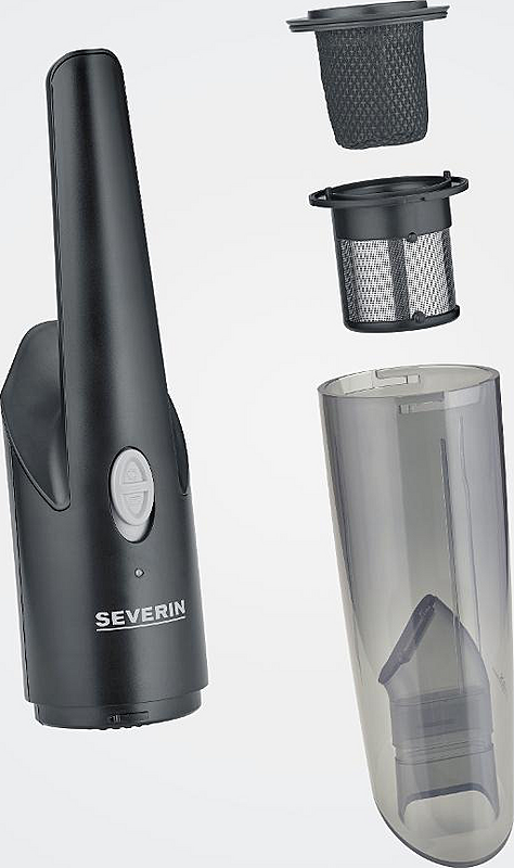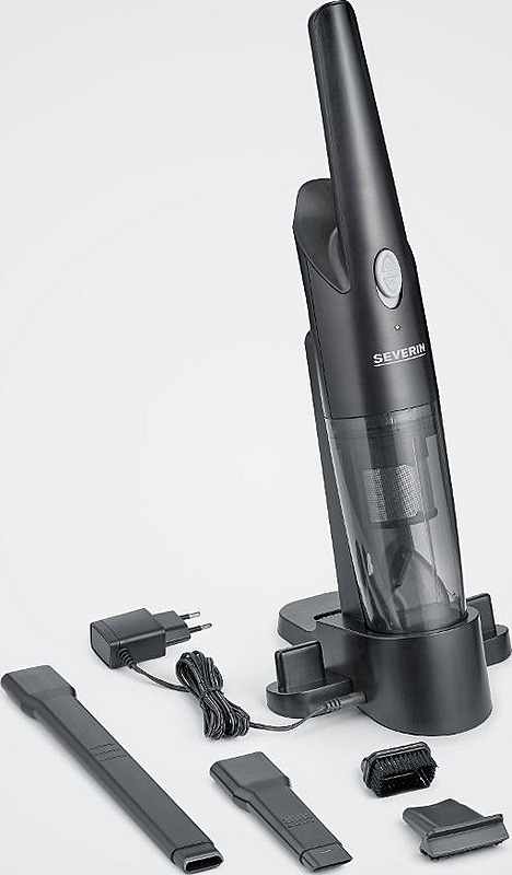 Ruční bezsáčkový vysavač Severin s dobíjecí základnou, mokrým sáním a objemem 0,3 l.