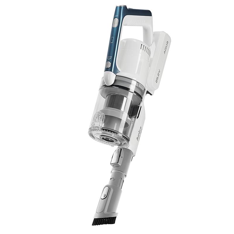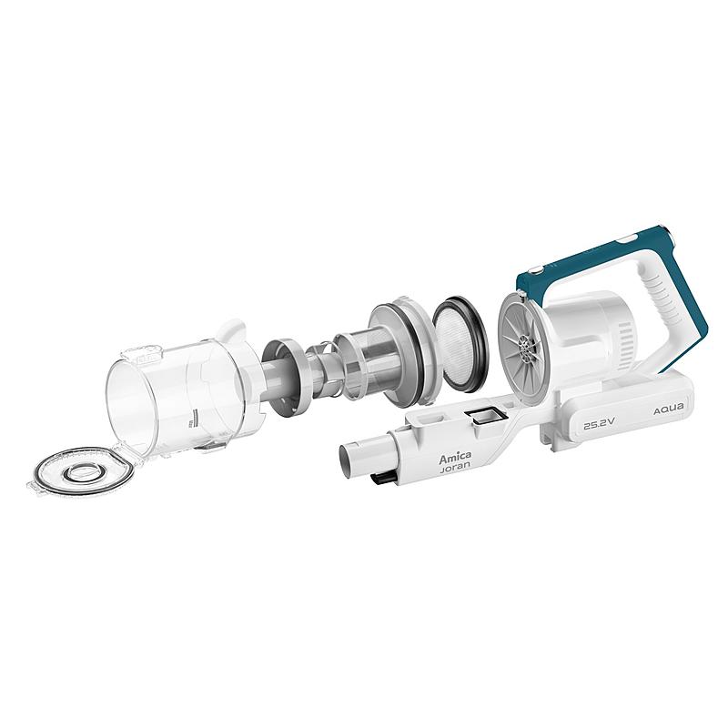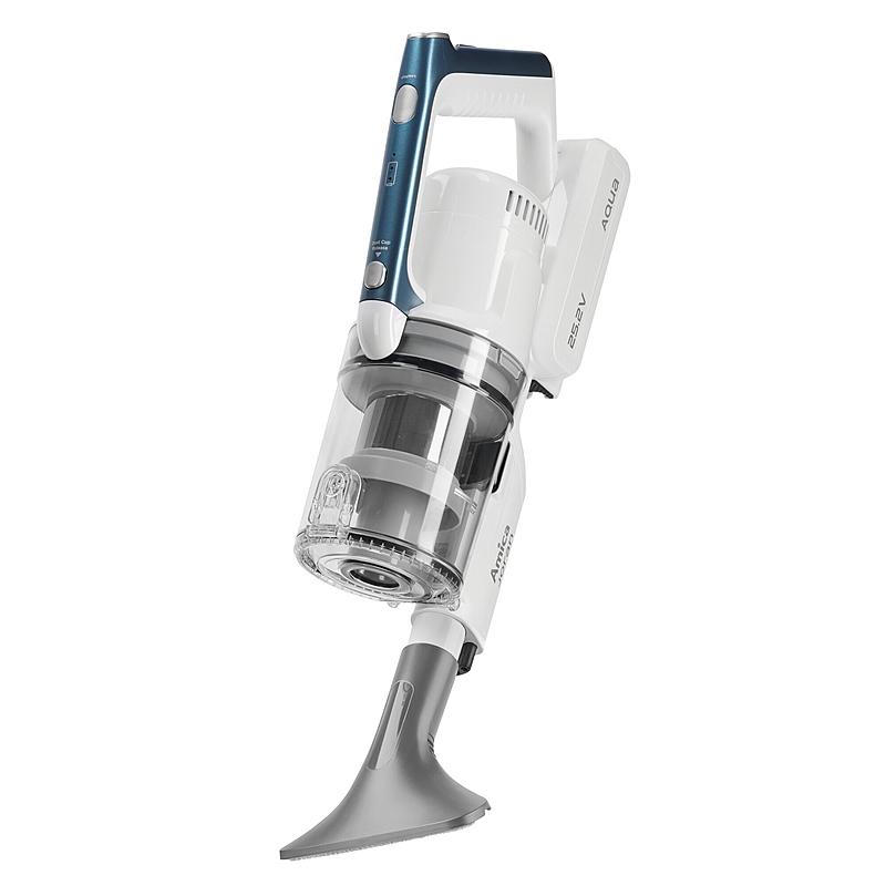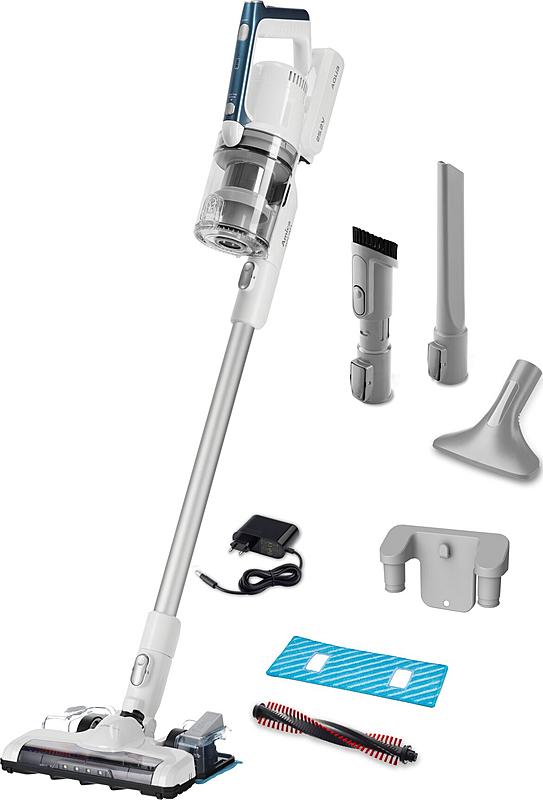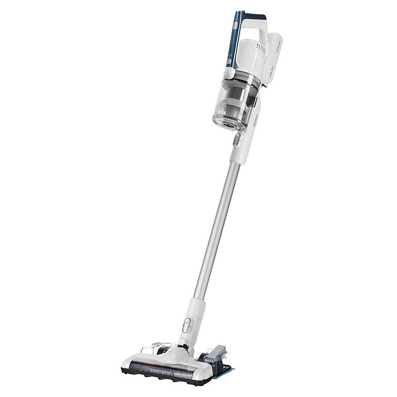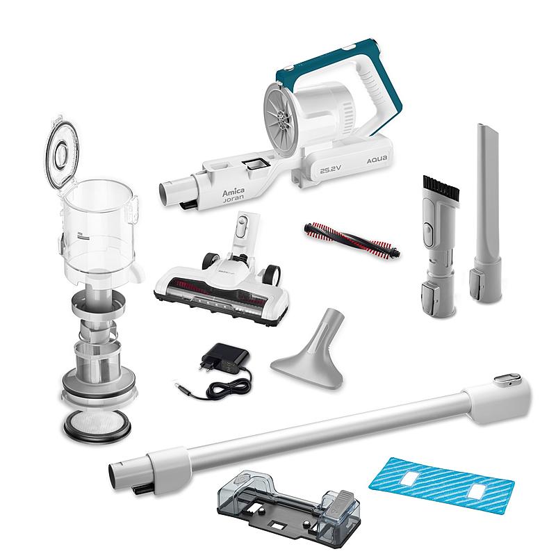 Tyčový bezdrátový vysavač 3 v 1 Amica s funkcí mopu, elektronickou regulací výkonu a LED osvětlením. Motorizovaná hlavice a nástěnný držák.