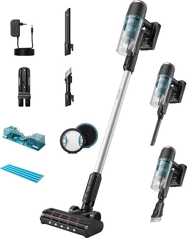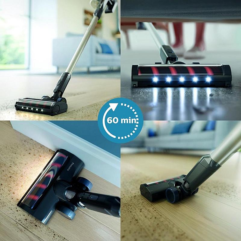 Tyčový vysavač Philips s LED osvětlenou hubicí, nástěnným držákem a třístupňovým filtračním systémem.