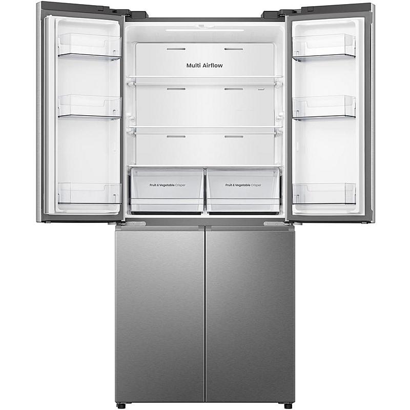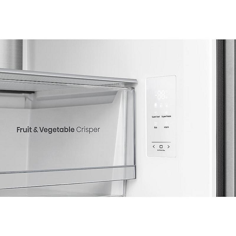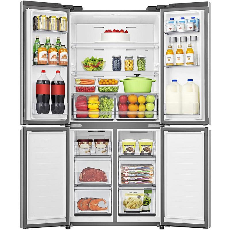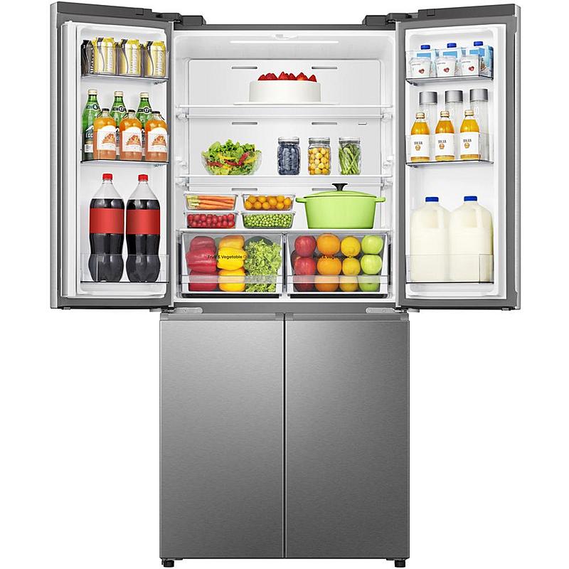 Smart americká lednice Hisense s invertorovým kompresorem, technologií Total NoFrost a LED osvětlením. Celkový objem 483 l a elektronické ovládání za dvířkami.
