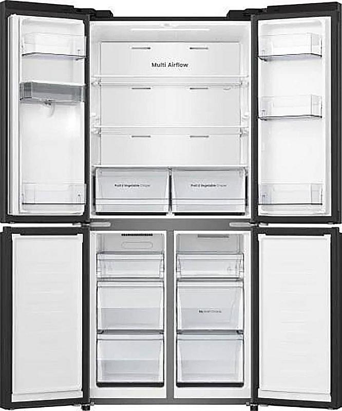 Smart americká lednice Hisense s možností ovládání přes aplikaci, antibakteriální ochranou a funkcí super chlazení. Dávkovač vody a celkový objem 482 l.