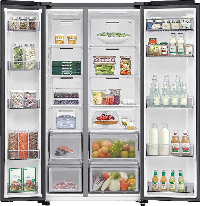 Americká lednice Samsung s invertorovým kompresorem, funkcí super chlazení i mrazení a interním displejem. Celkový objem 659 l a možnost ovládání přes WiFi.