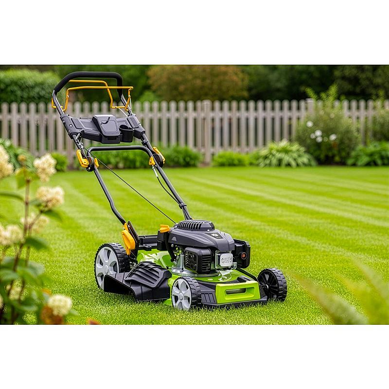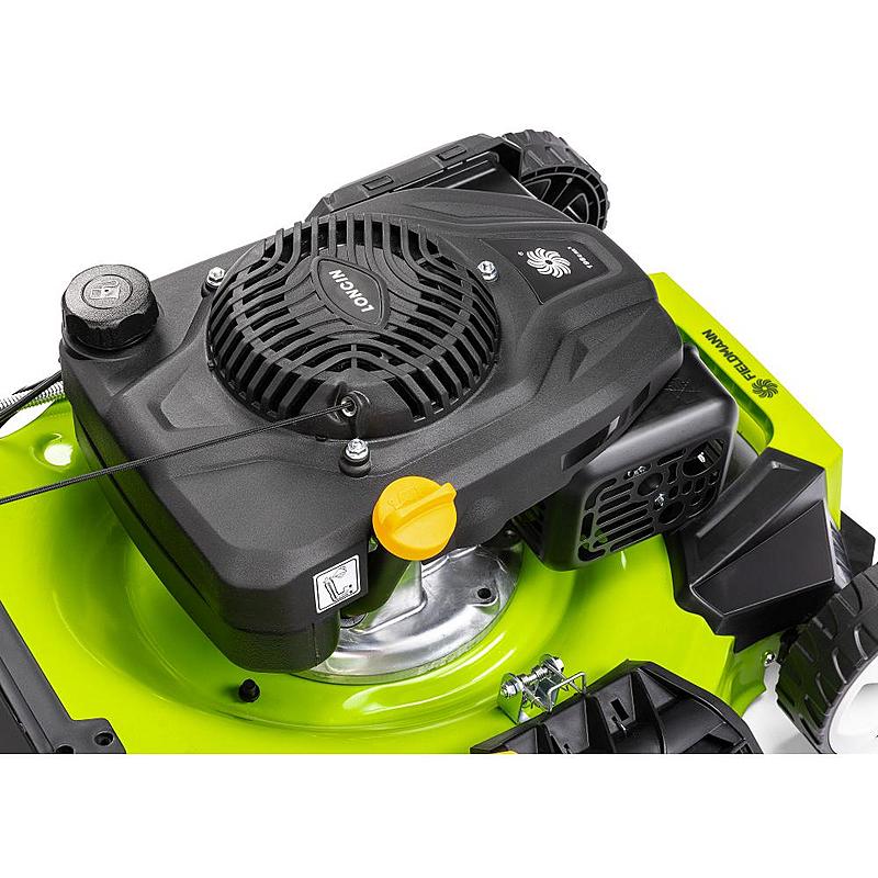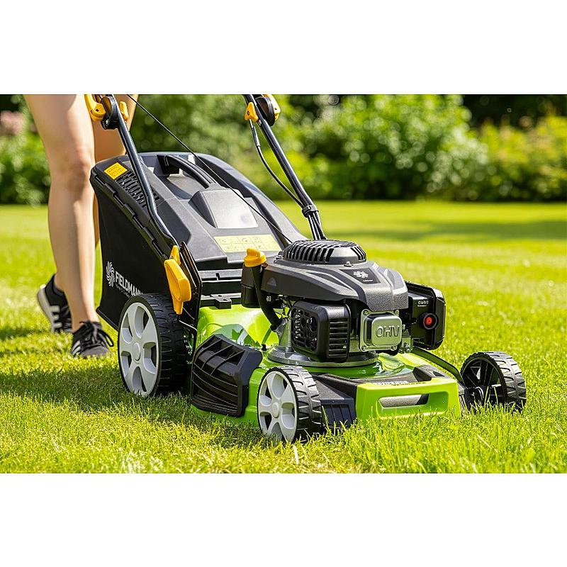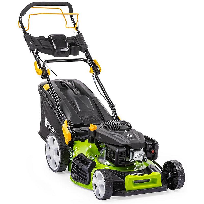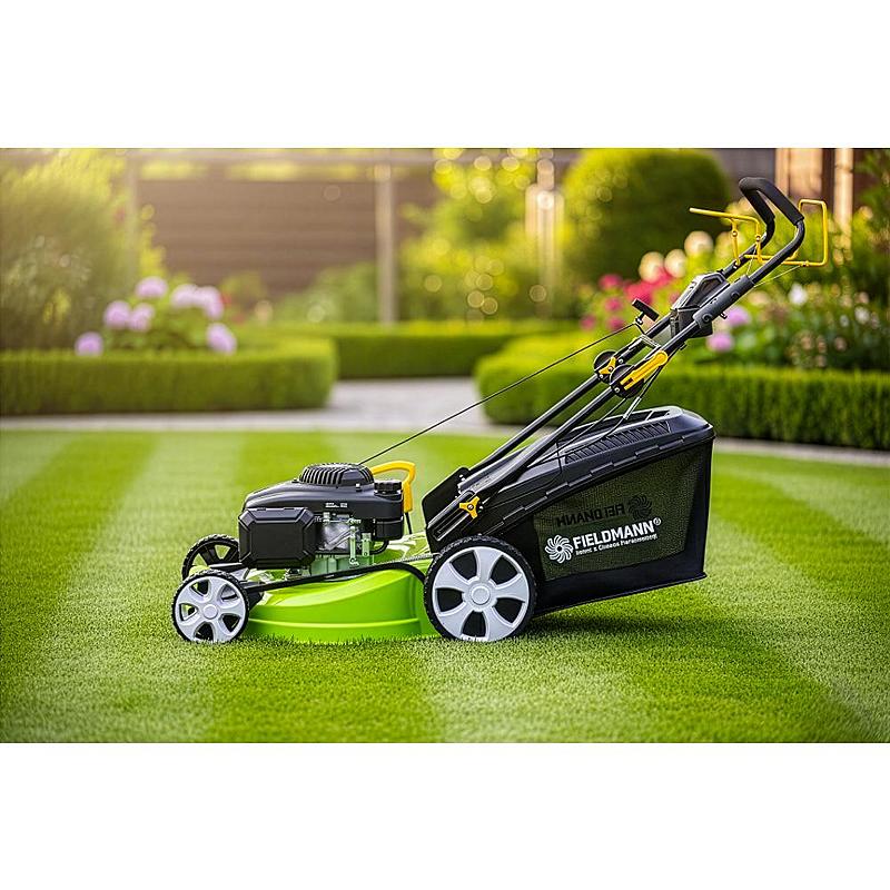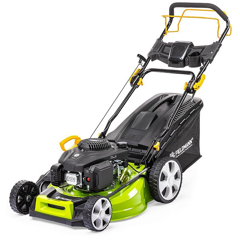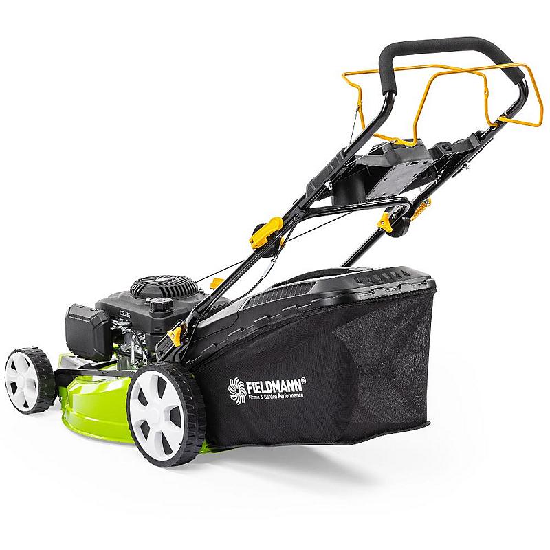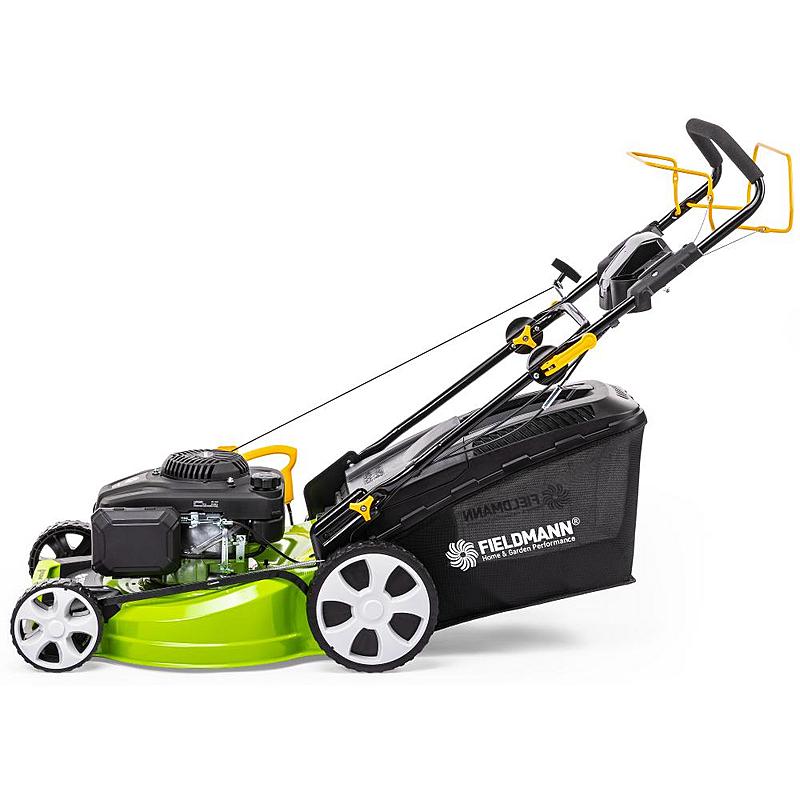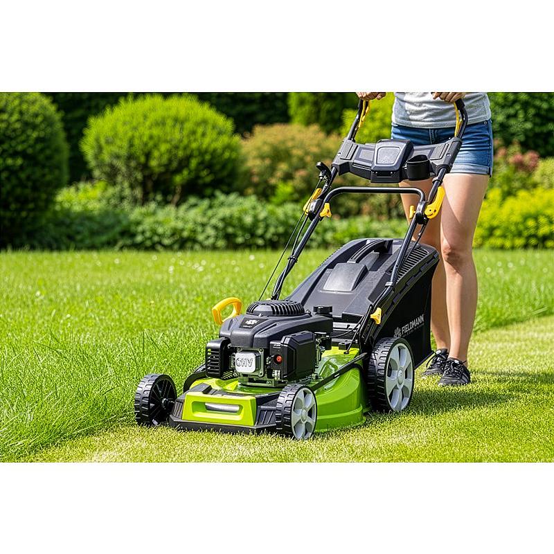 Benzínová sekačka Fieldmann s pojezdem, motorem 196cc, výkonem 4 kW a záběrem 51 cm.