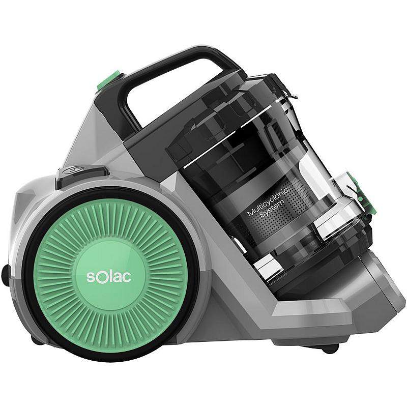 Bezsáčkový vysavač Solac s multicyklonovou filtrací, omyvatelnými filtry a příkonem 800 W.