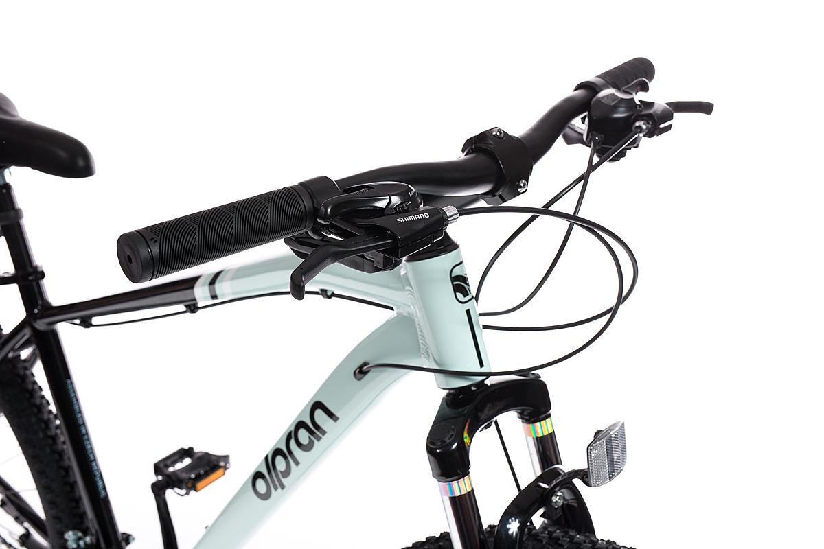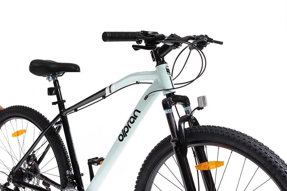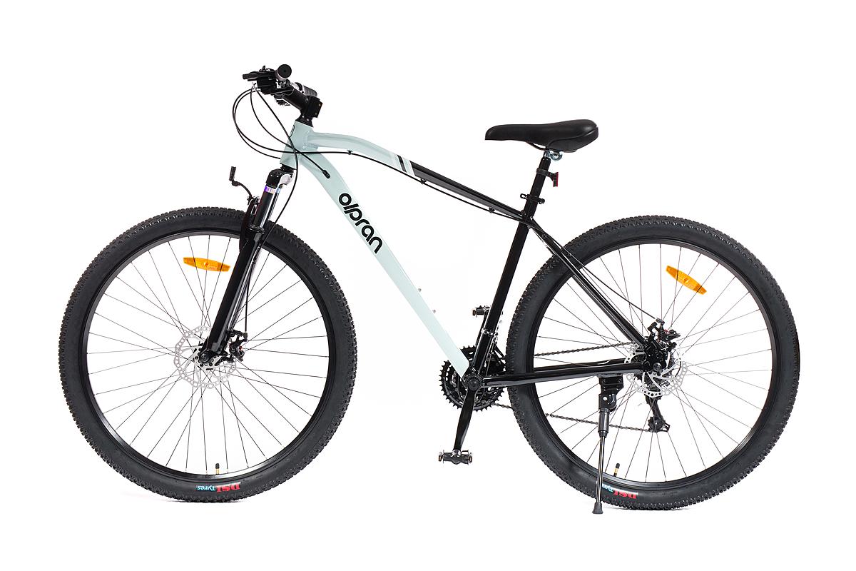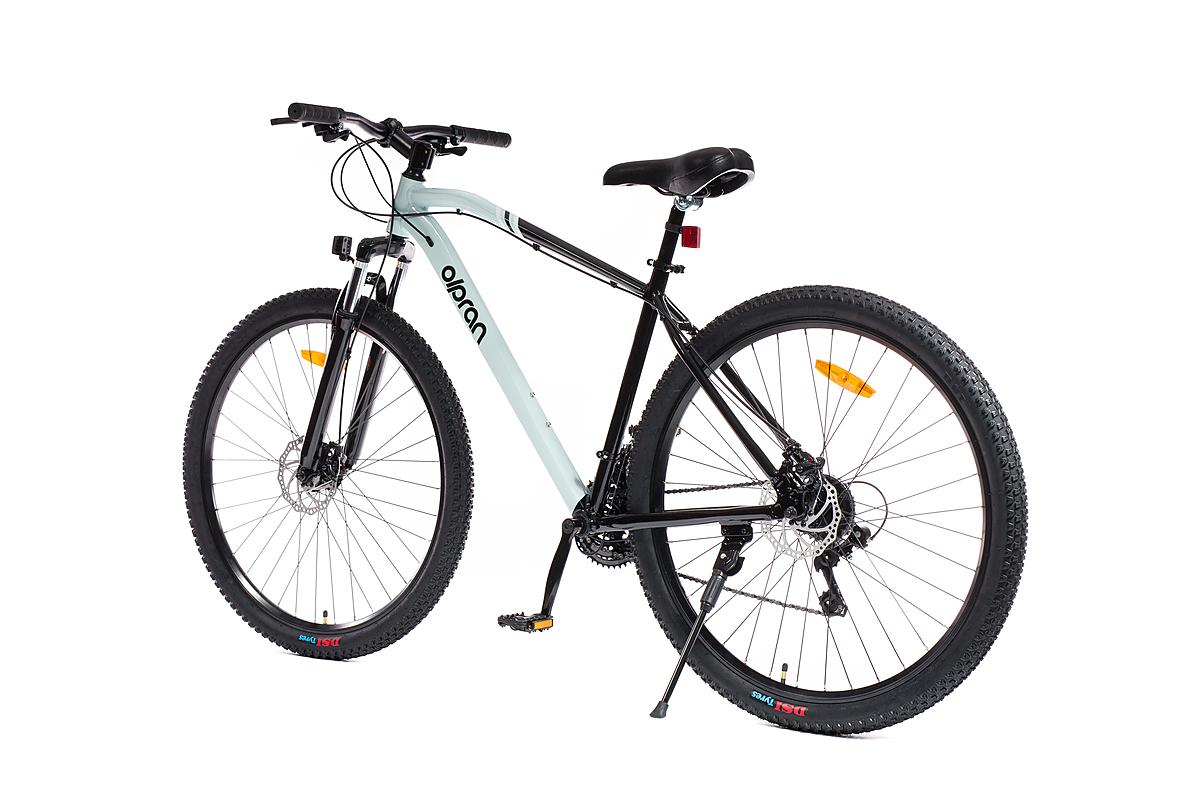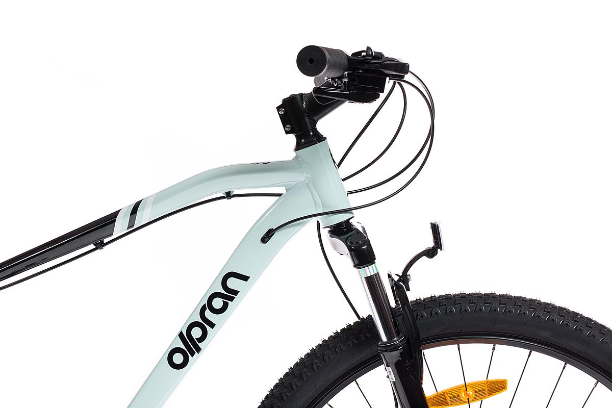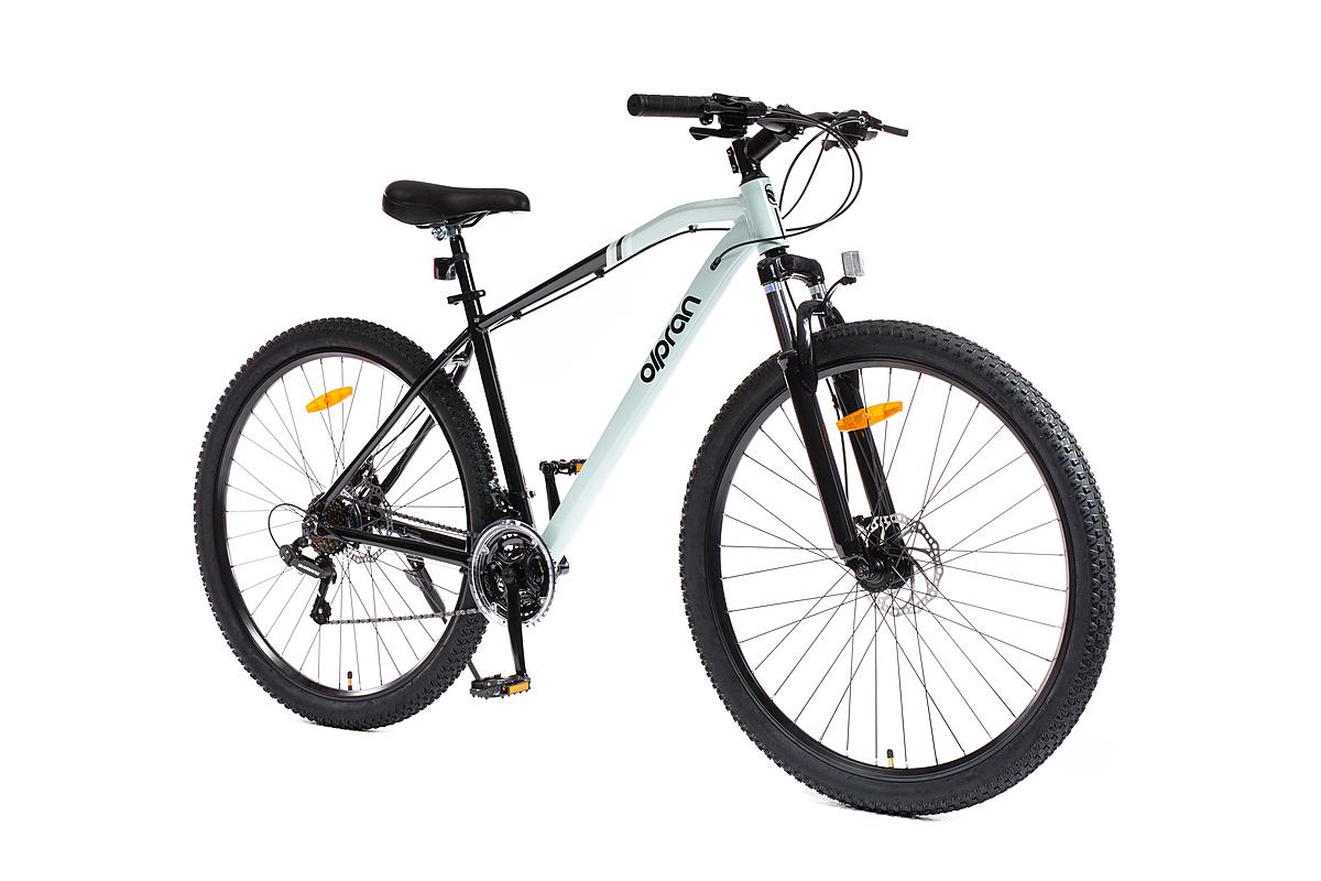 Horské kolo Olpran s hliníkovým rámem, značkovými komponenty Shimano a mechanickými kotoučovými brzdami. Odpružená přední vidlice a velikost rámu 19".