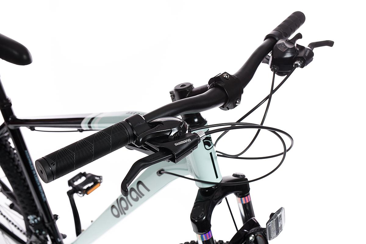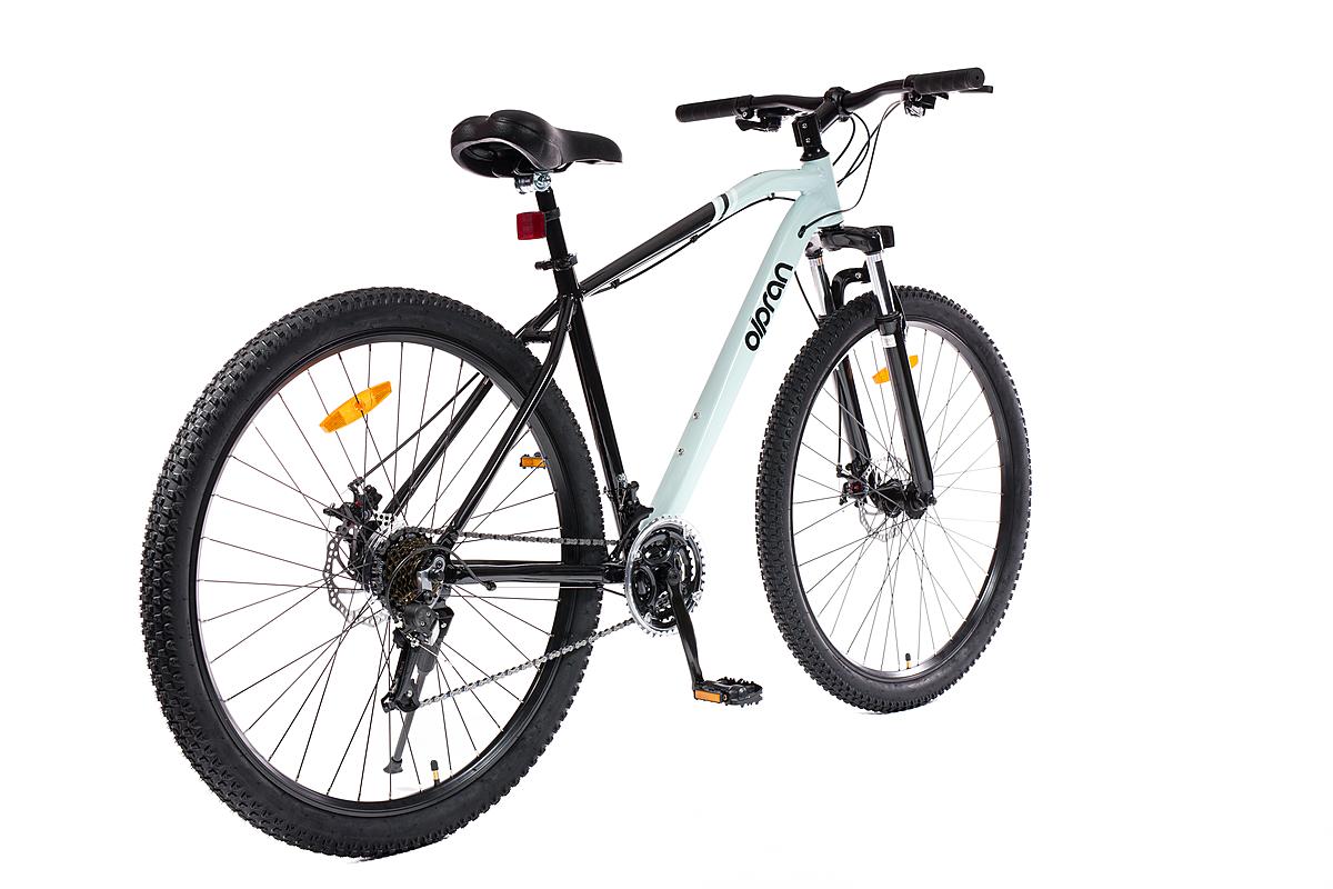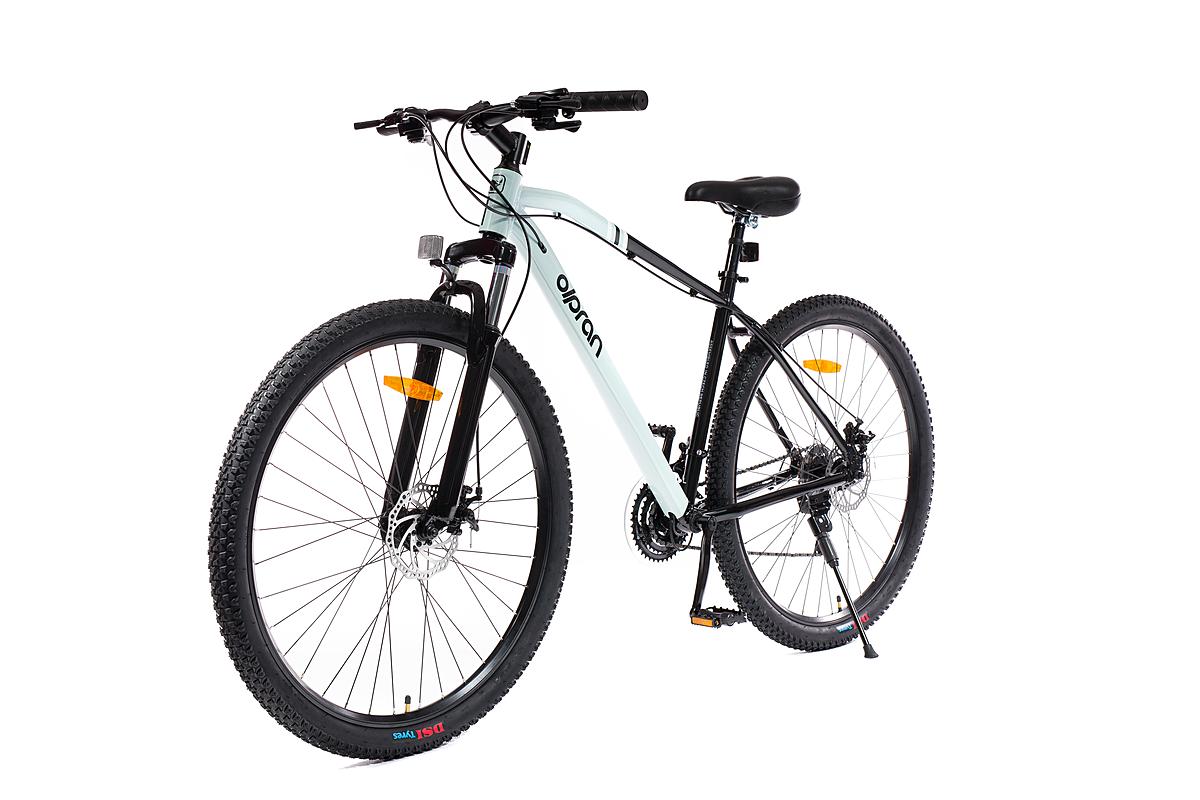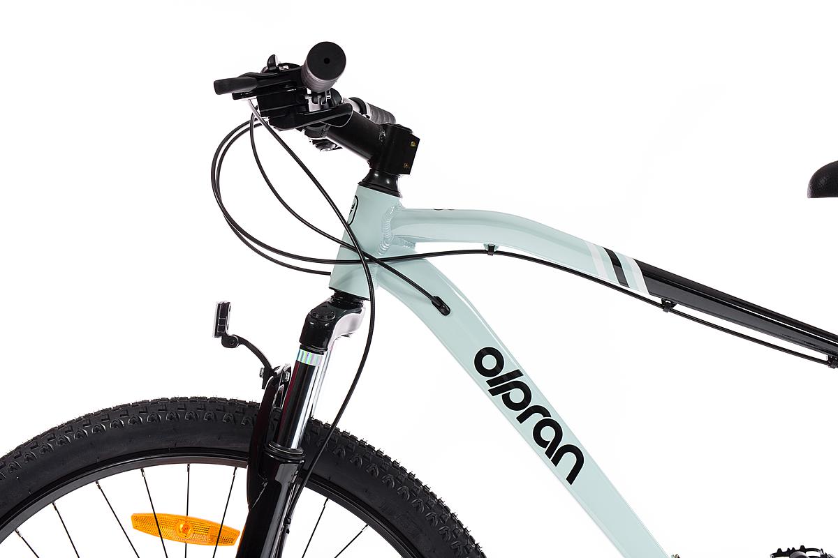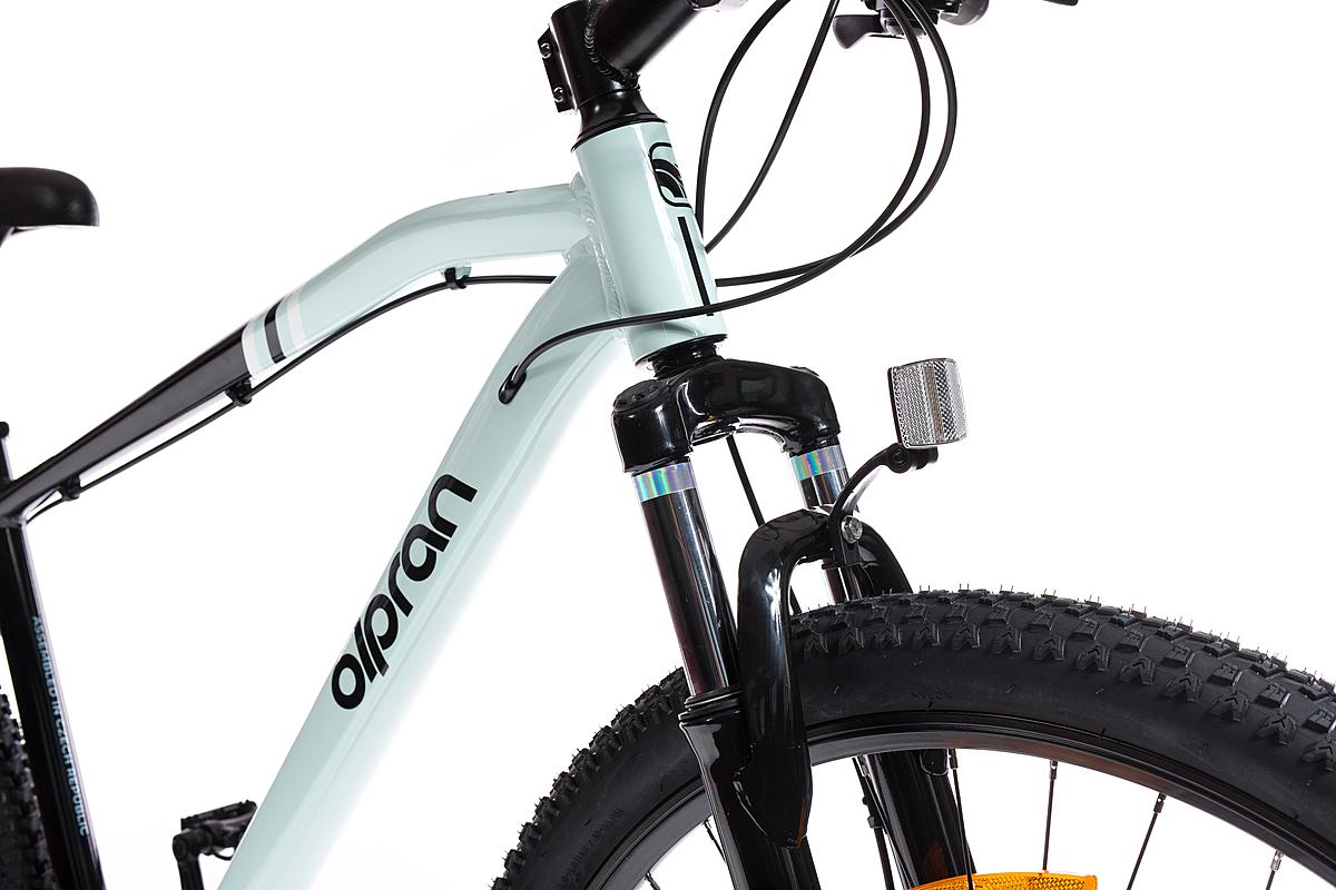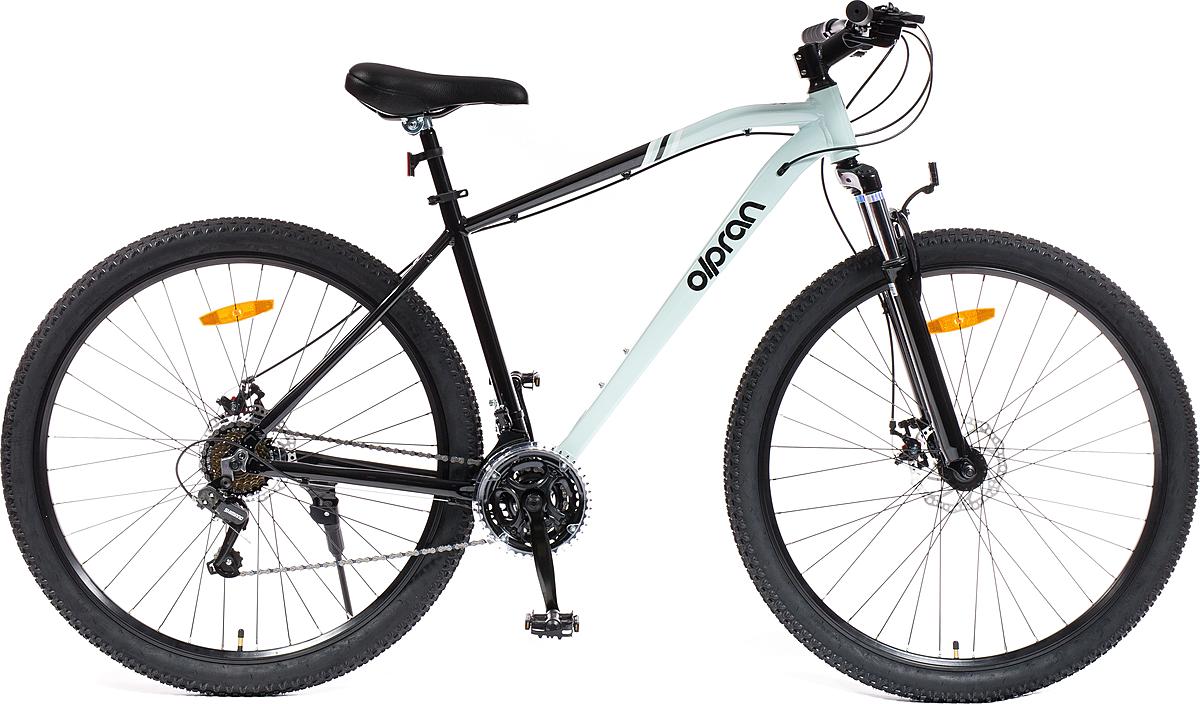 Horské kolo Olpran s hliníkovým rámem, značkovými komponenty Shimano a mechanickými kotoučovými brzdami. Odpružená přední vidlice a velikost rámu 19".