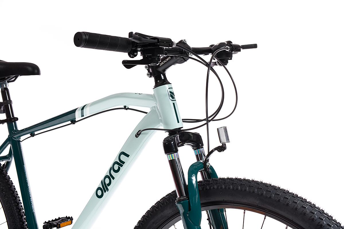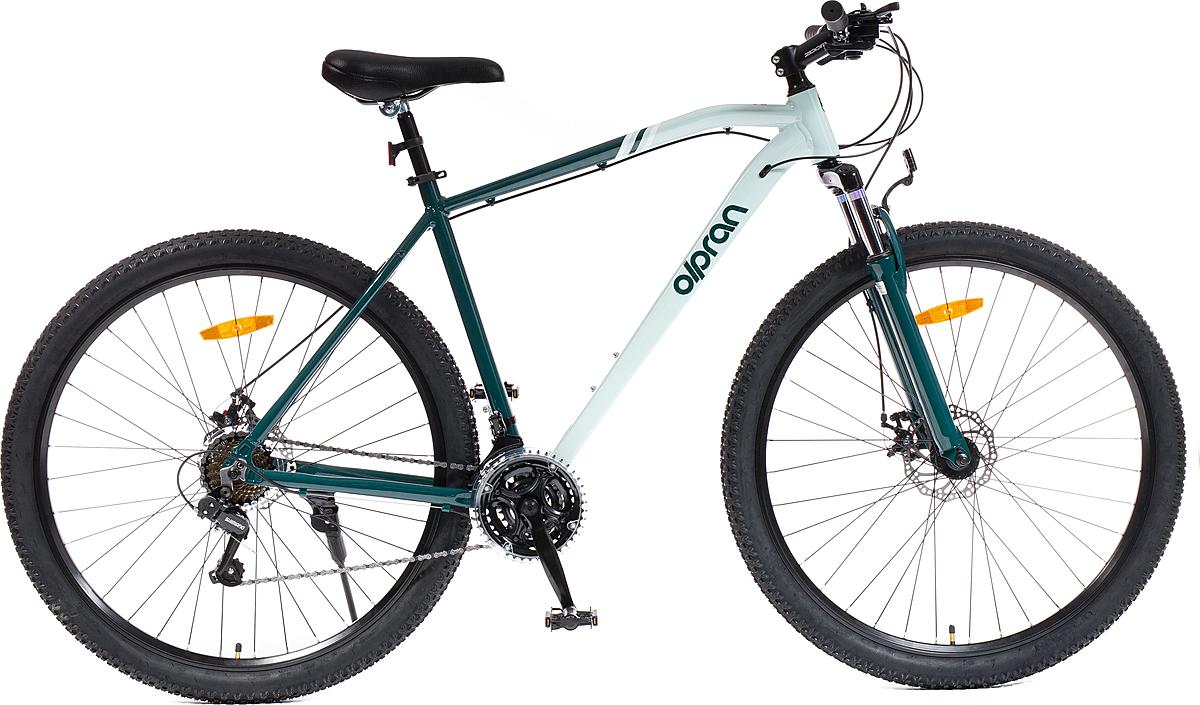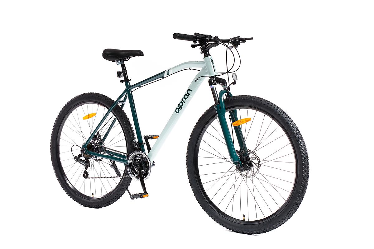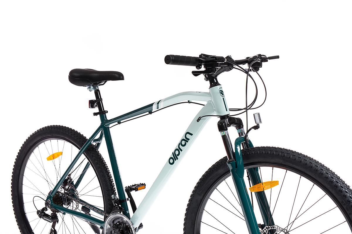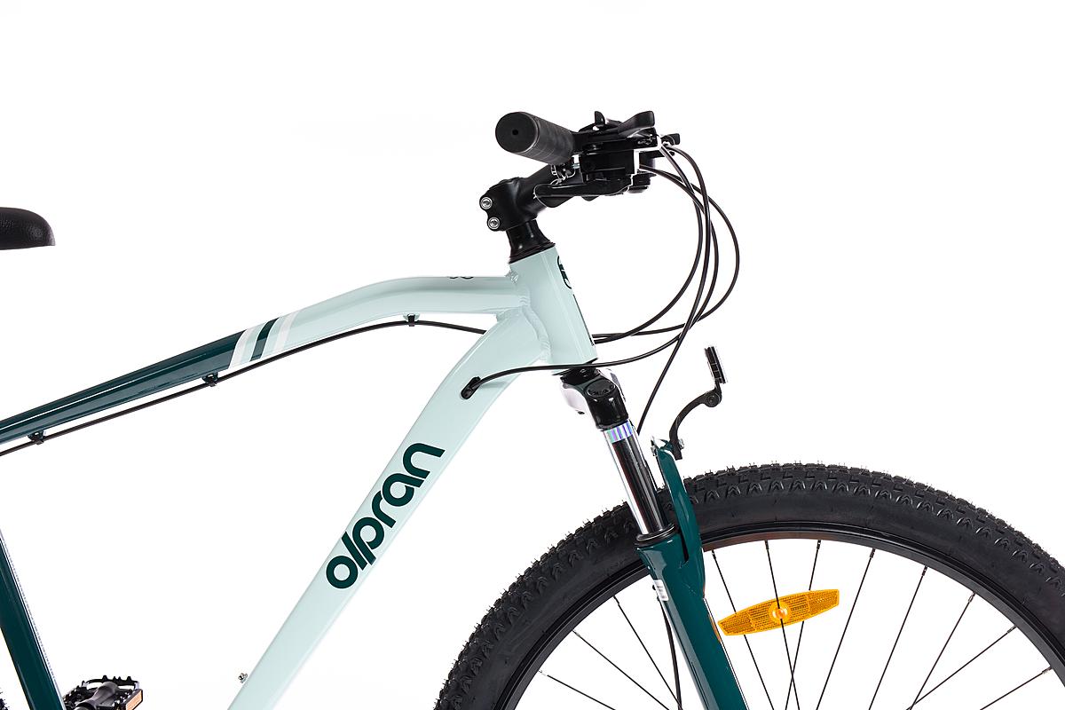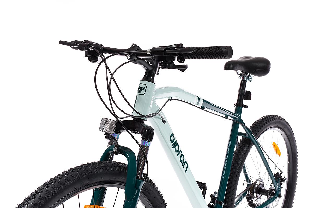 Horské kolo Olpran s hliníkovým rámem, značkovými komponenty Shimano a mechanickými kotoučovými brzdami. Odpružená přední vidlice a velikost rámu 21".