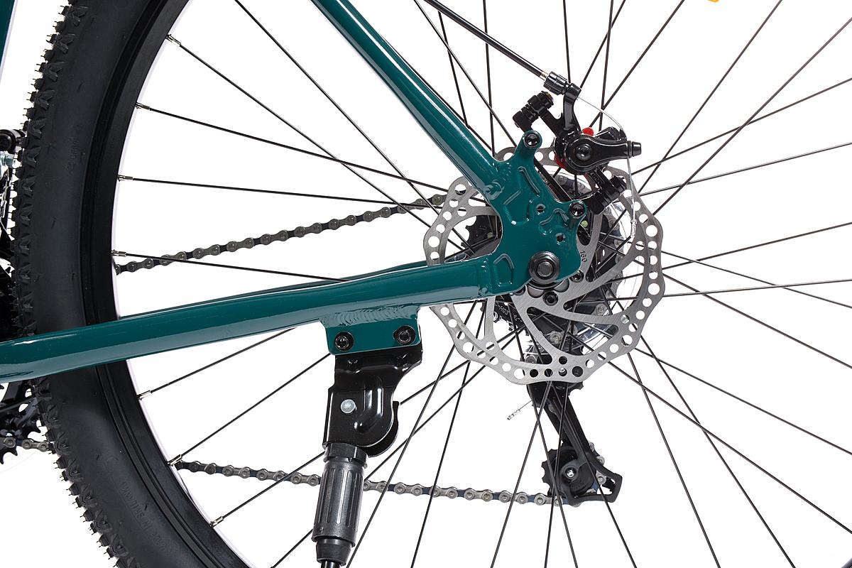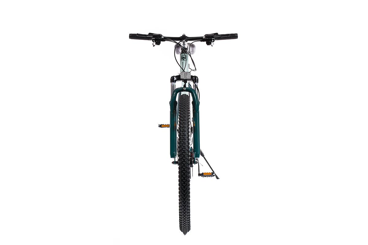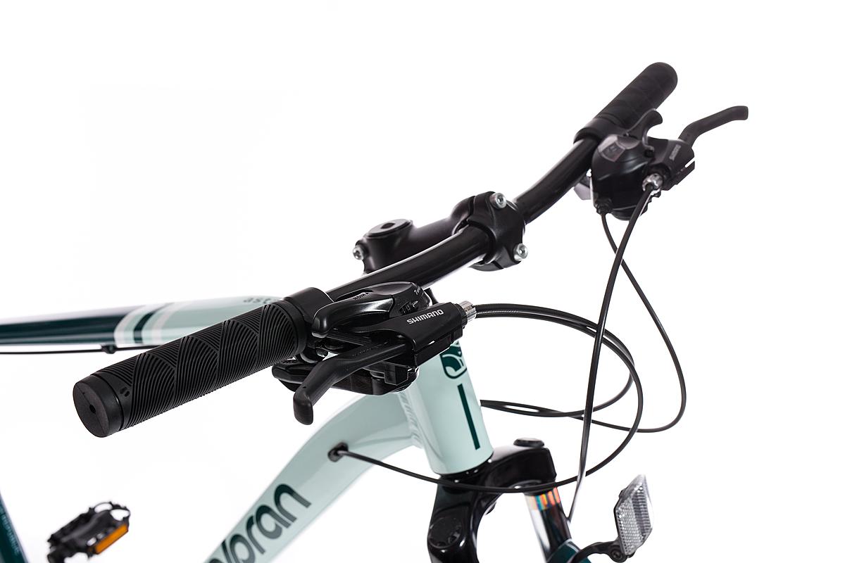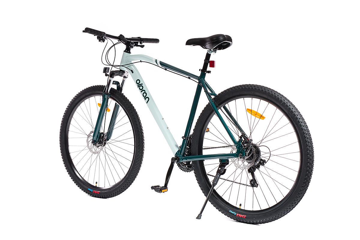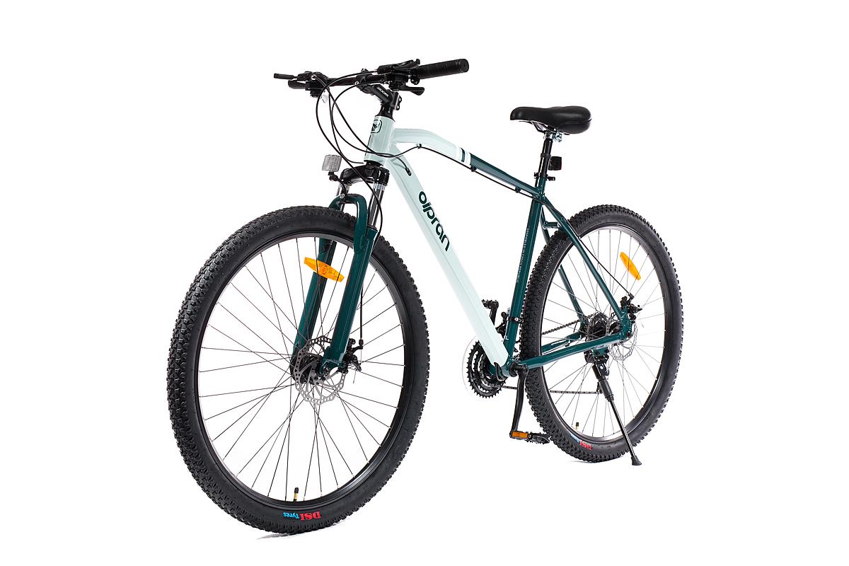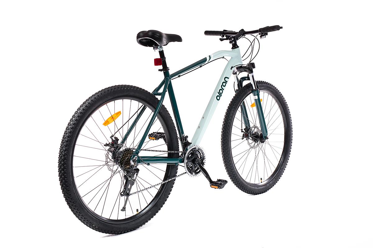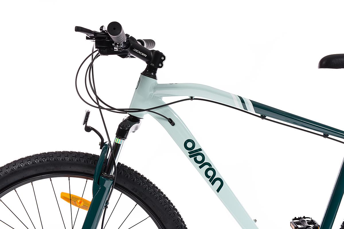 Horské kolo Olpran s hliníkovým rámem, značkovými komponenty Shimano a mechanickými kotoučovými brzdami. Odpružená přední vidlice a velikost rámu 21".