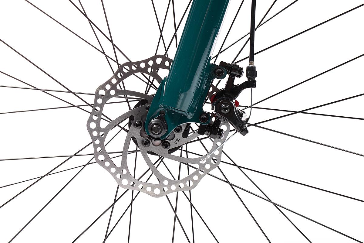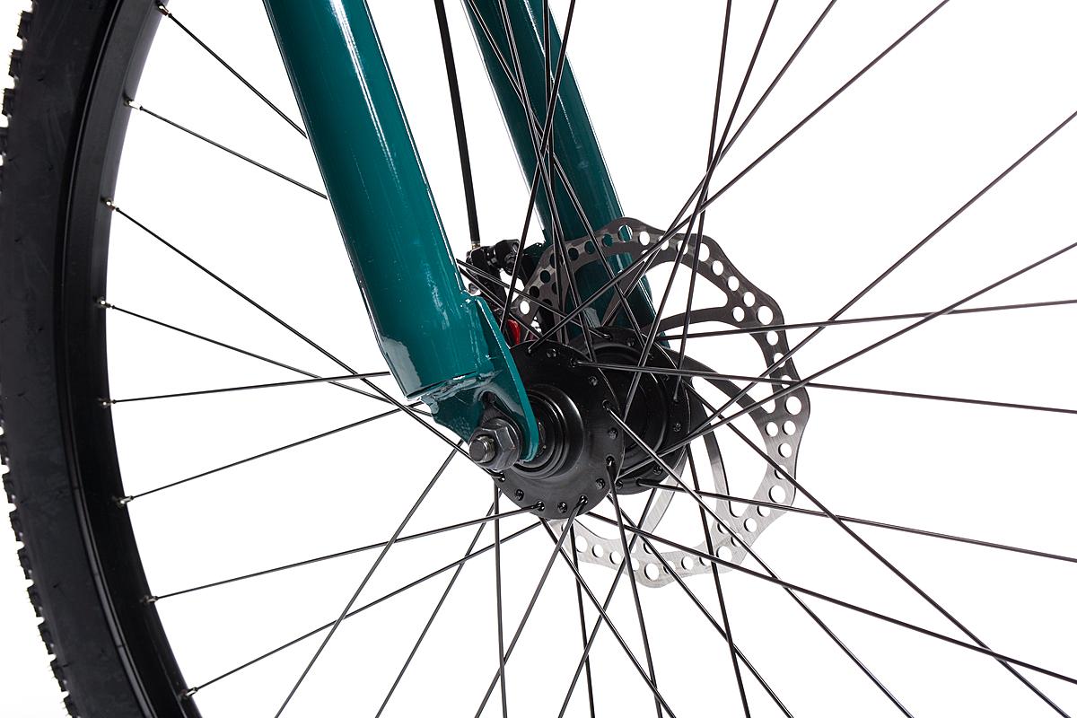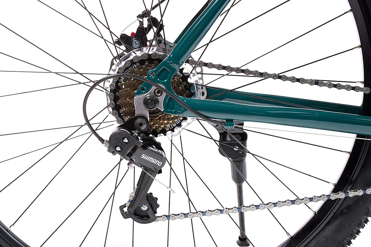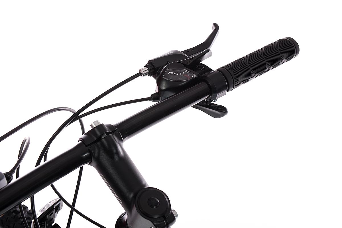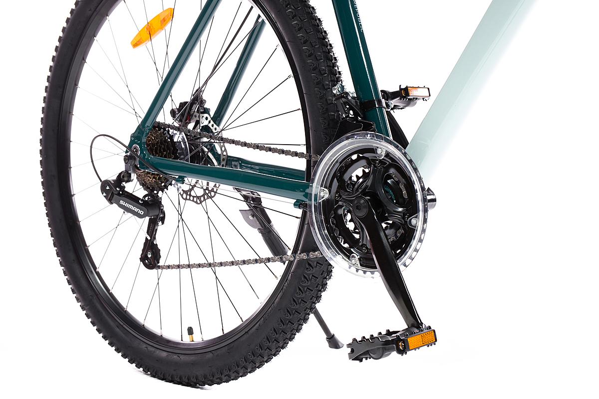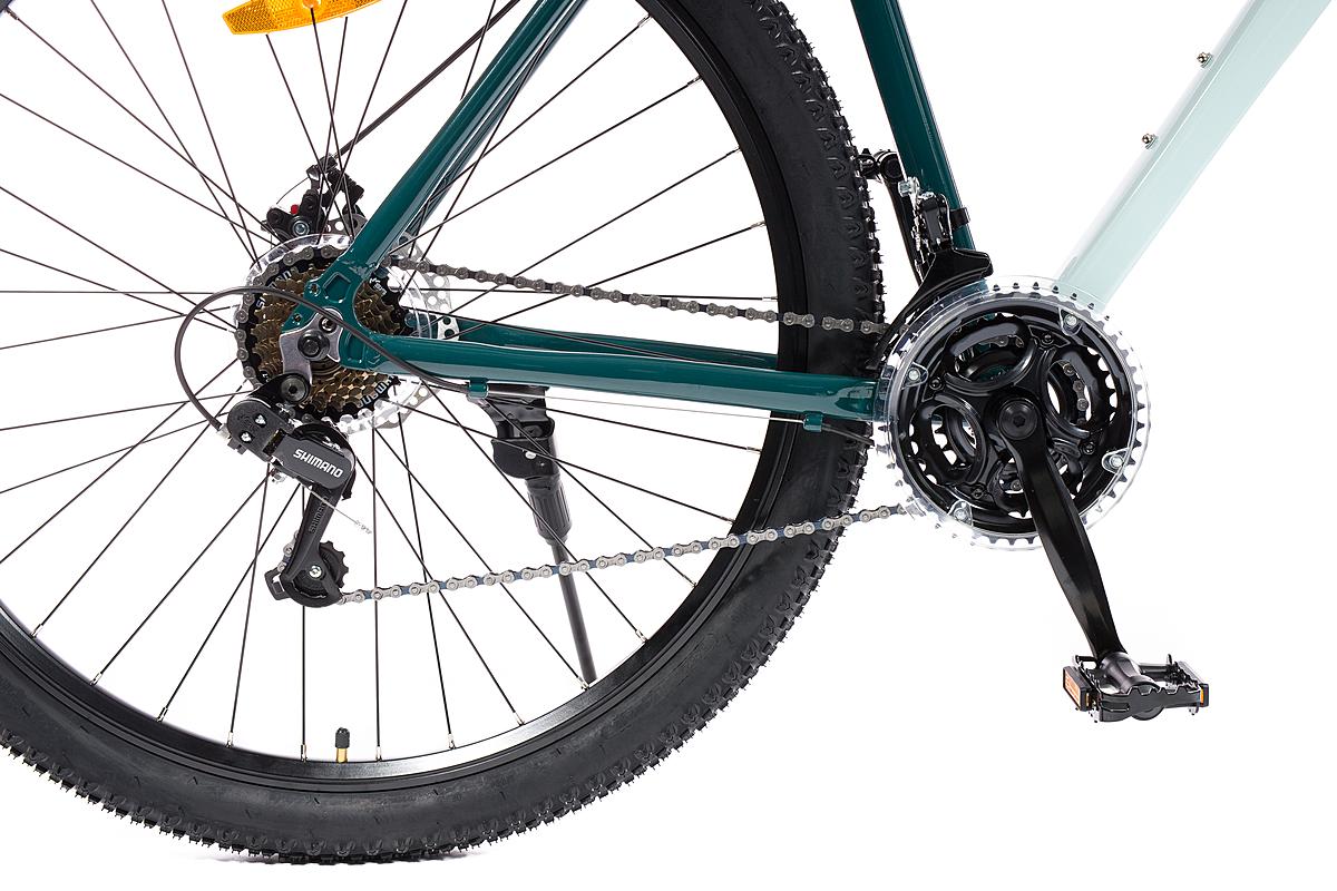 Horské kolo Olpran s hliníkovým rámem, značkovými komponenty Shimano a mechanickými kotoučovými brzdami. Odpružená přední vidlice a velikost rámu 21".
