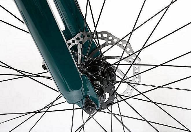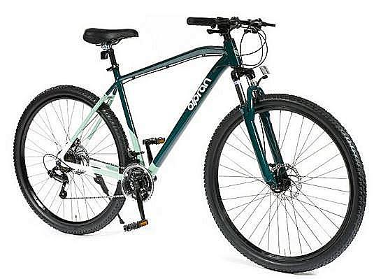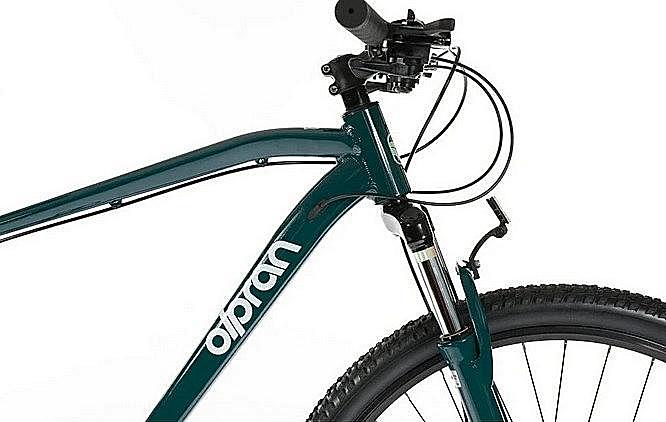 Horské kolo Olpran s hliníkovým rámem, značkovými komponenty Shimano a mechanickými kotoučovými brzdami. Odpružená přední vidlice a velikost rámu 21"