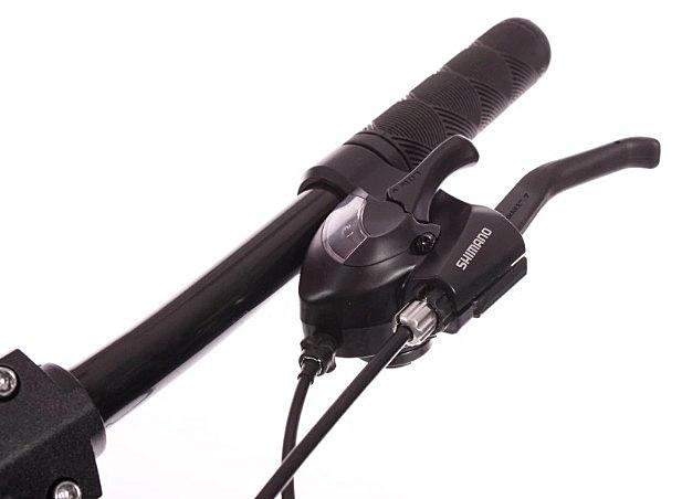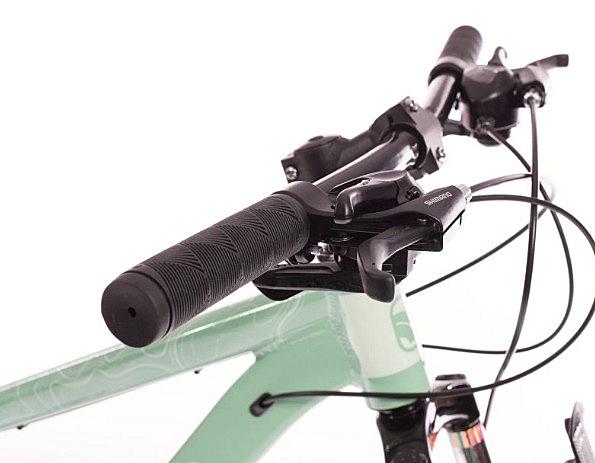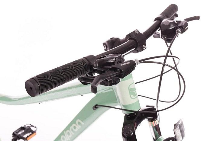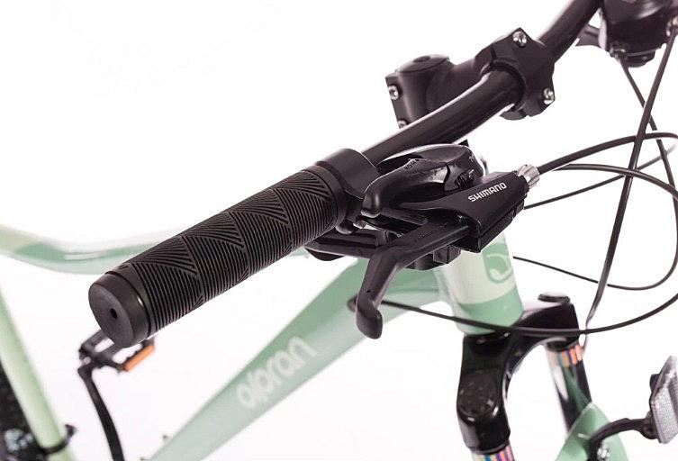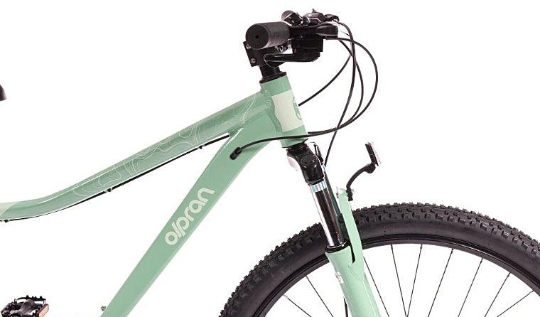 Dámské horské kolo Olpran s hliníkovým rámem, odpruženou přední vidlicí a značkovými komponenty Shimano.