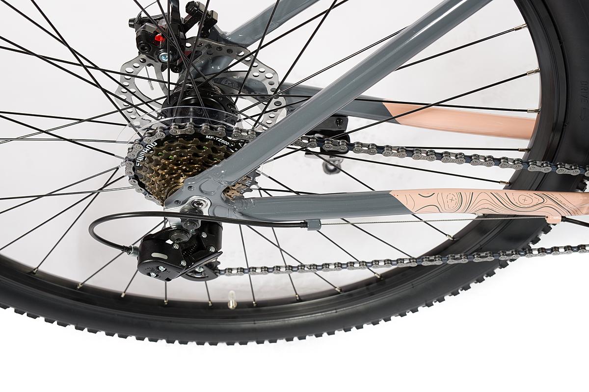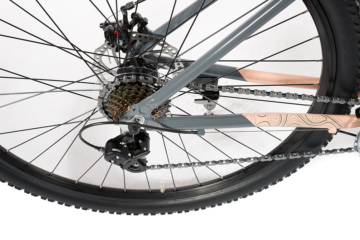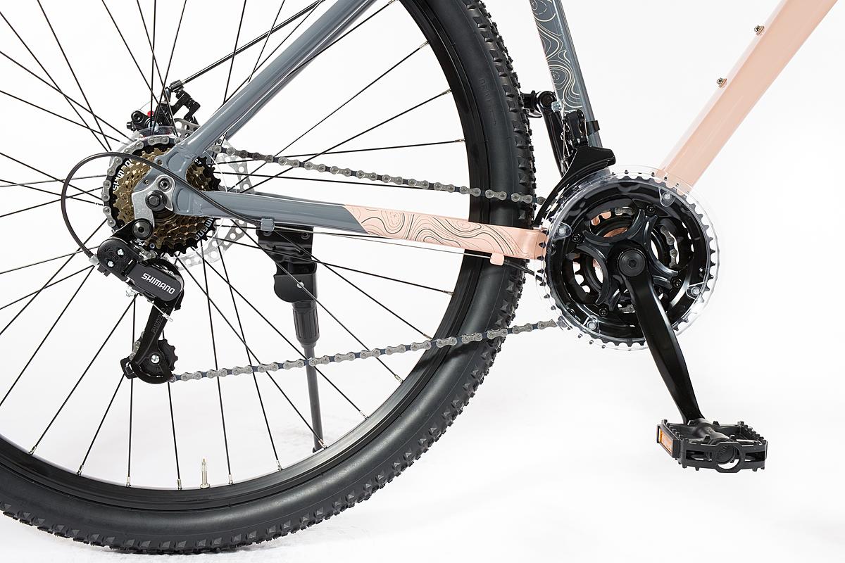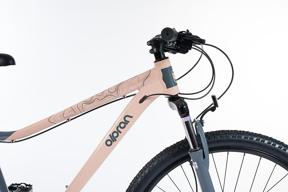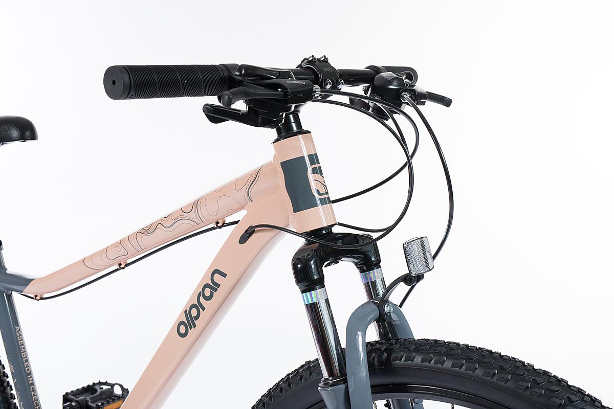 Dámské horské kolo Olpran s hliníkovým rámem, odpruženou přední vidlicí a značkovými komponenty Shimano.
