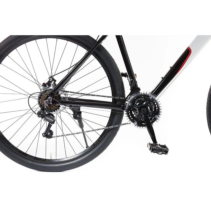 Unisex kolo s hliníkovým 19palcovým rámem, značkovými kompomenty Shimano a 21 převody. Mechanické kotoučové brzdy a 28palcový trekový vzorek.