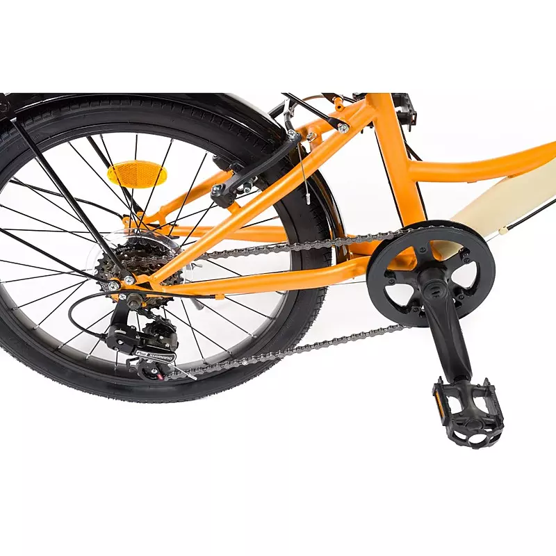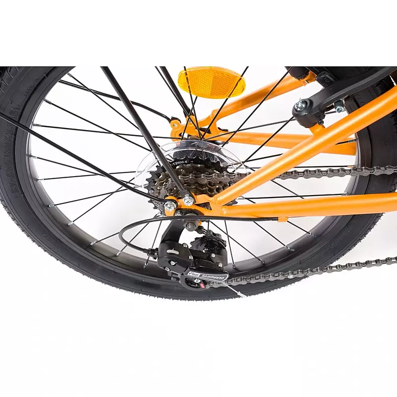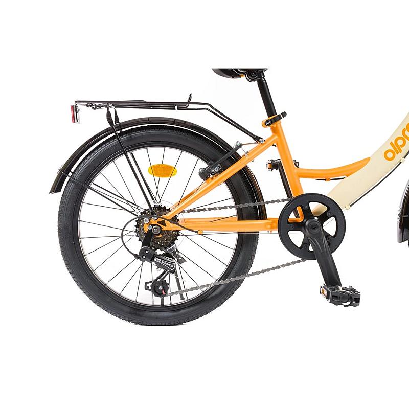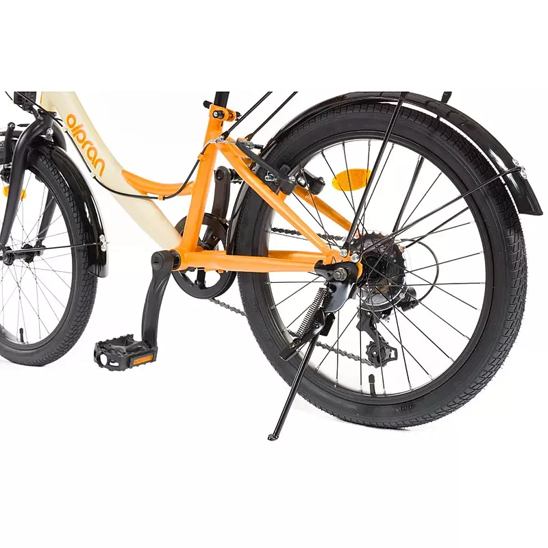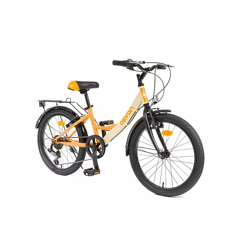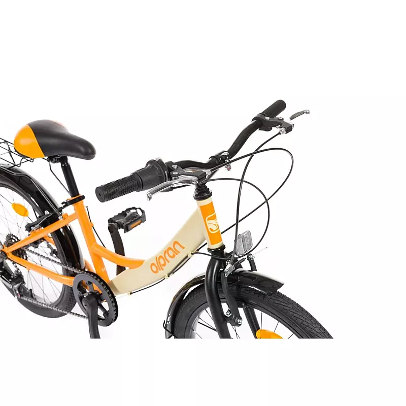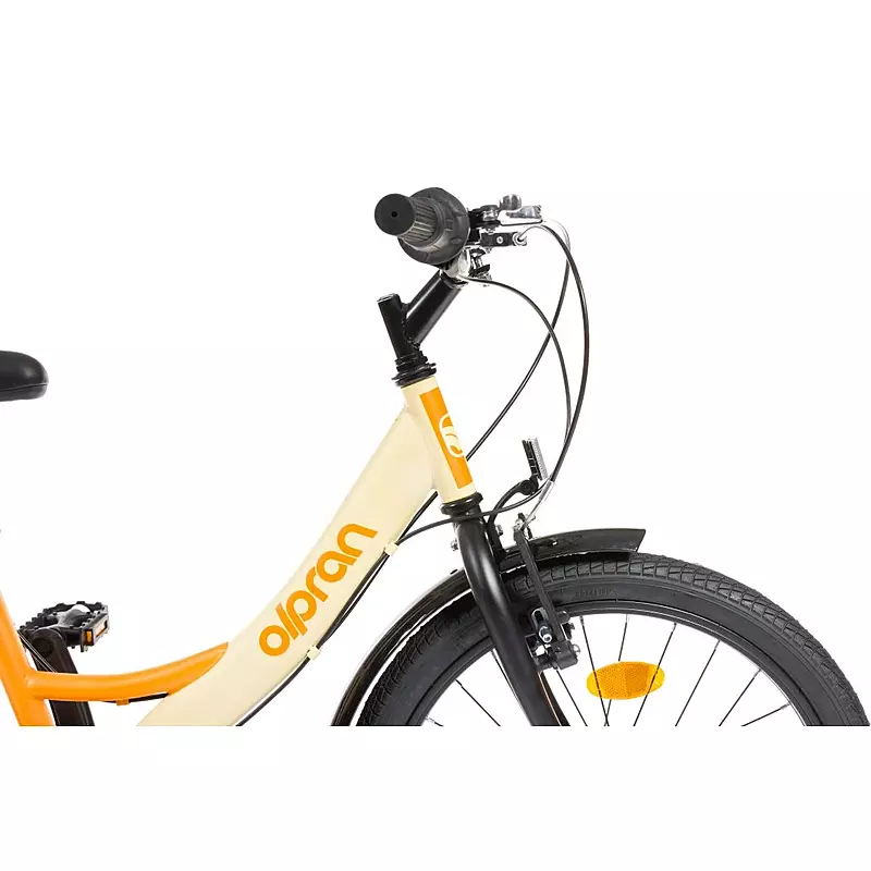 Dětské kolo Olpran s ocelovým 13palcovým rámem, odpruženou přední vidlicí a značkovými komponenty Shimano. Ráfkové brzdy a 6 převodů přehazovačka.