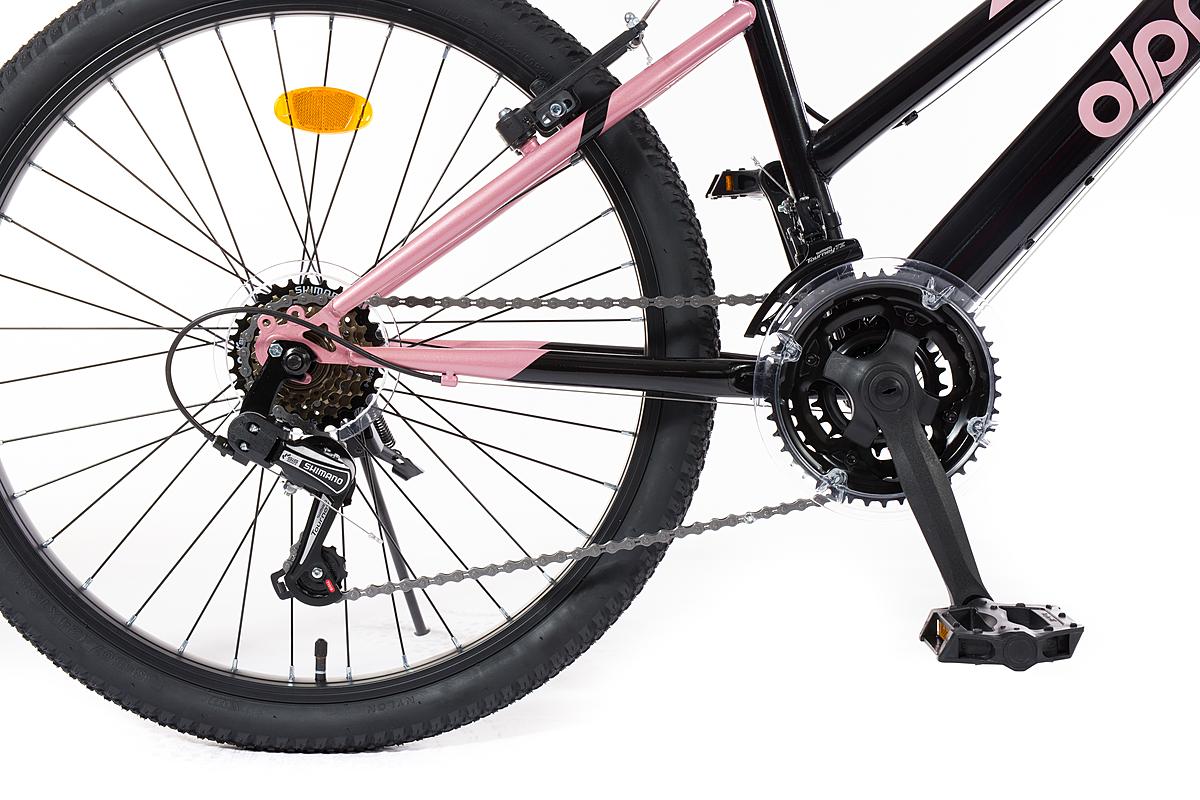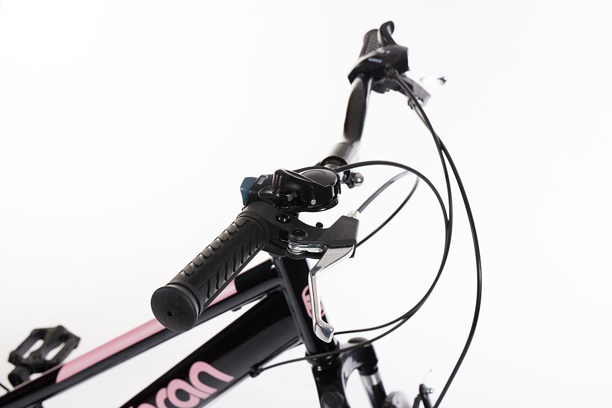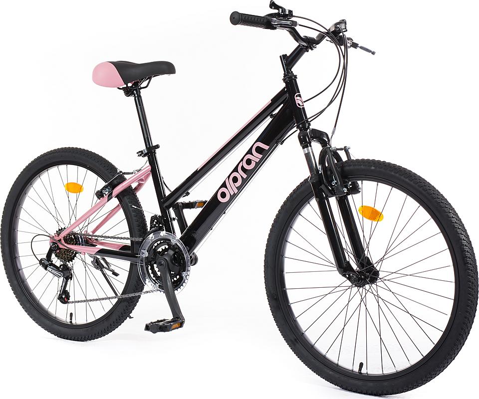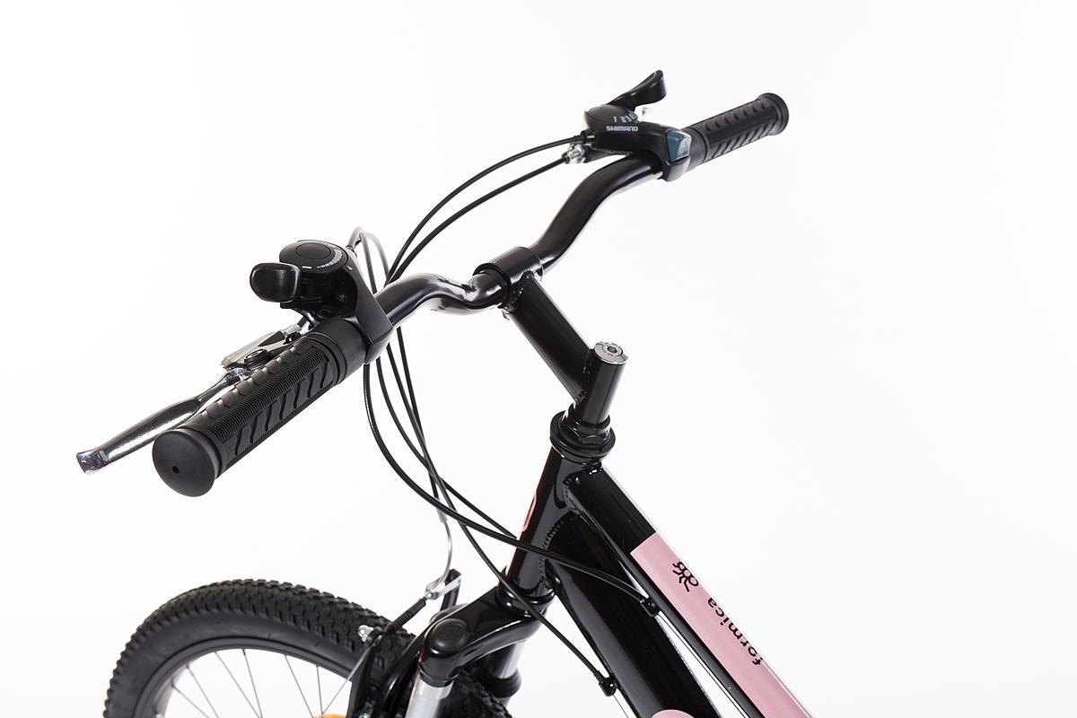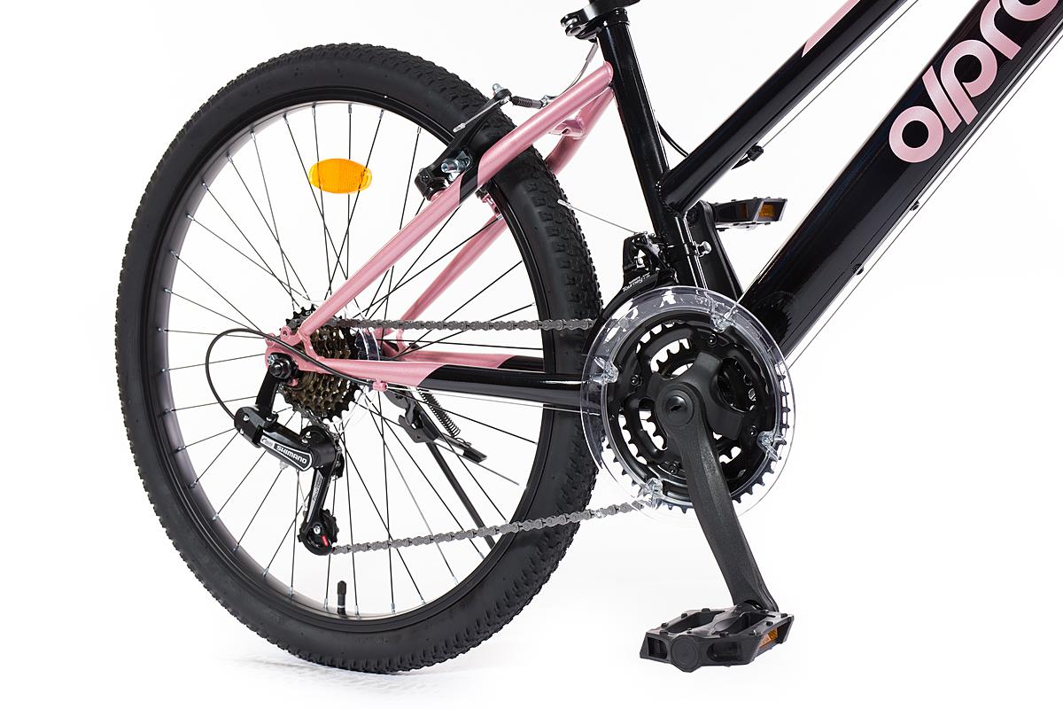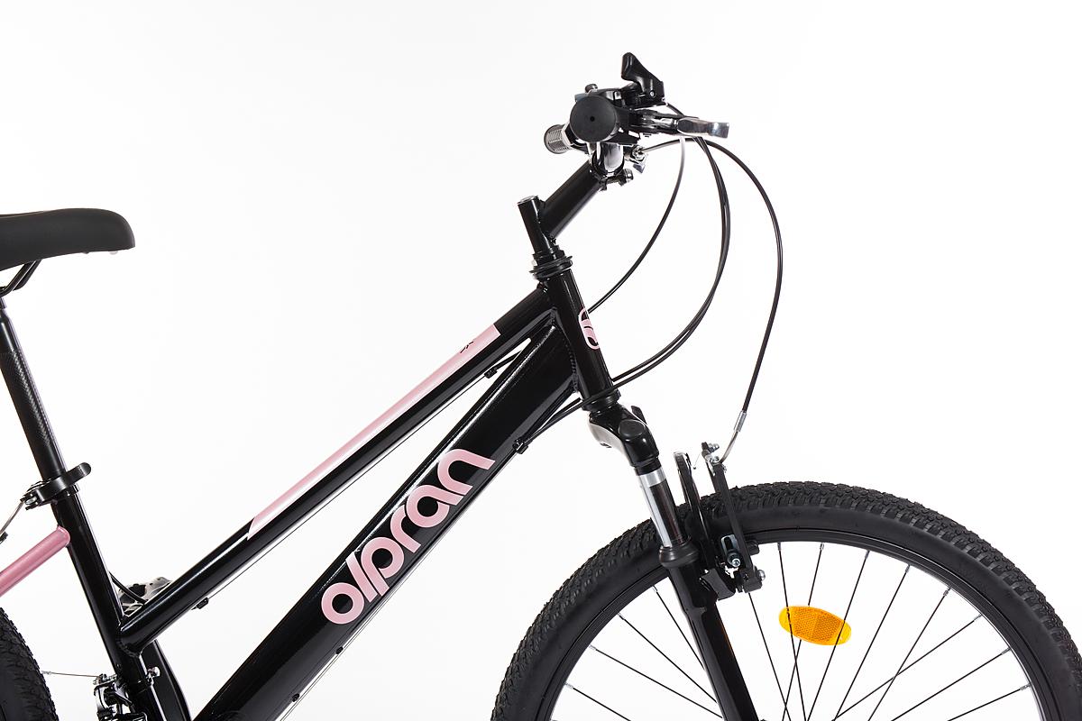 Dětské kolo Olpran s ocelovým 15palcovým rámem, odpruženou přední vidlicí a značkovými komponenty Shimano. Ráfkové brzdy a 18 převodů přehazovačka.
