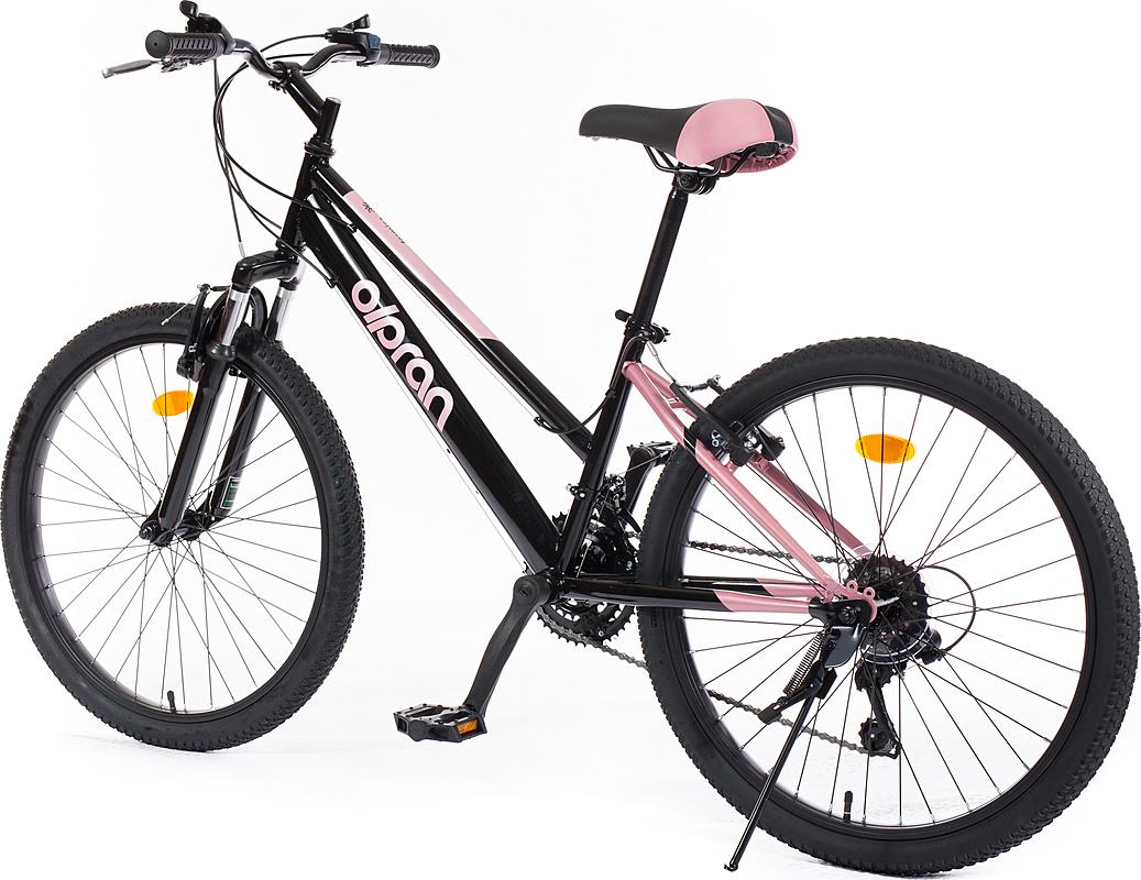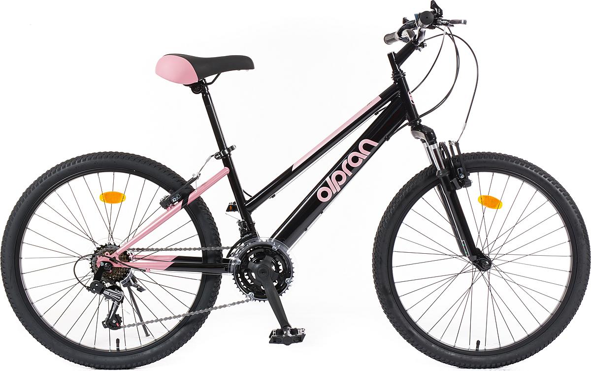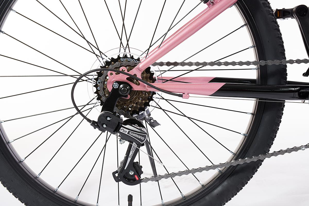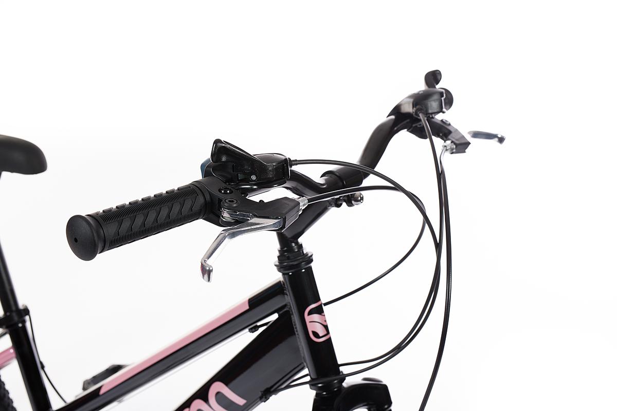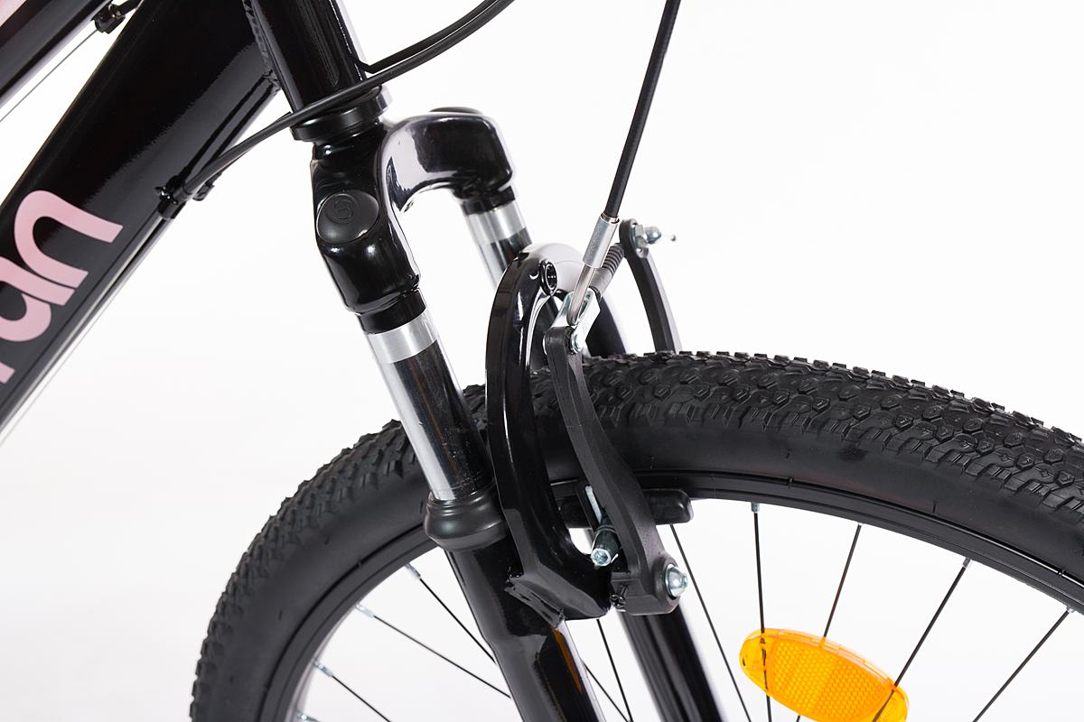 Dětské kolo Olpran s ocelovým 15palcovým rámem, odpruženou přední vidlicí a značkovými komponenty Shimano. Ráfkové brzdy a 18 převodů přehazovačka.
