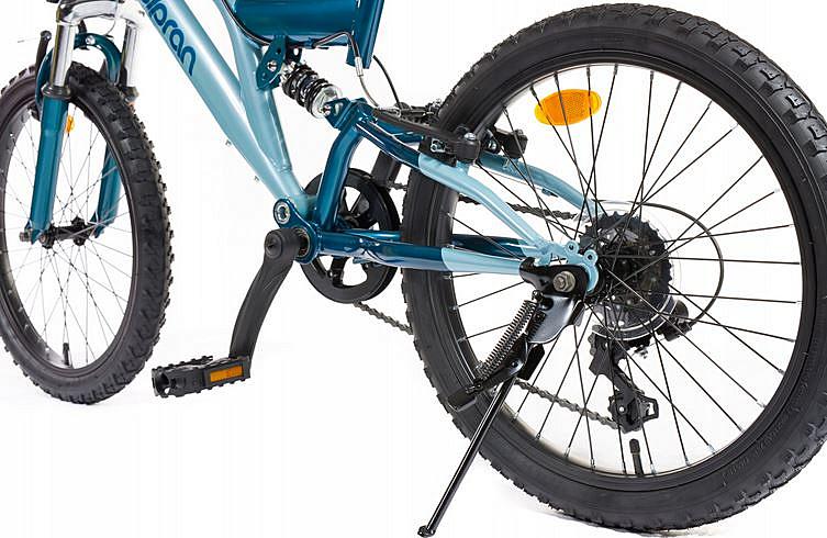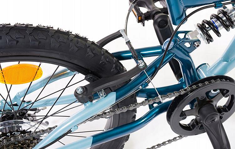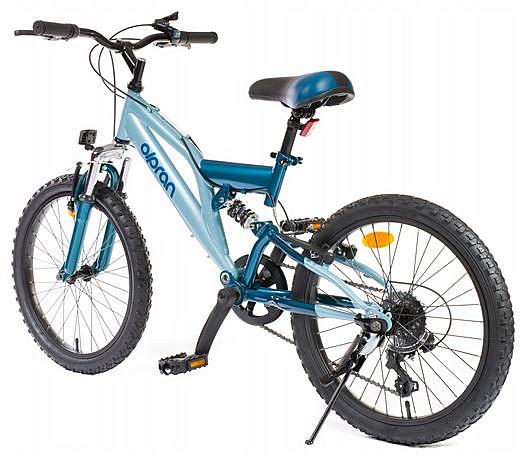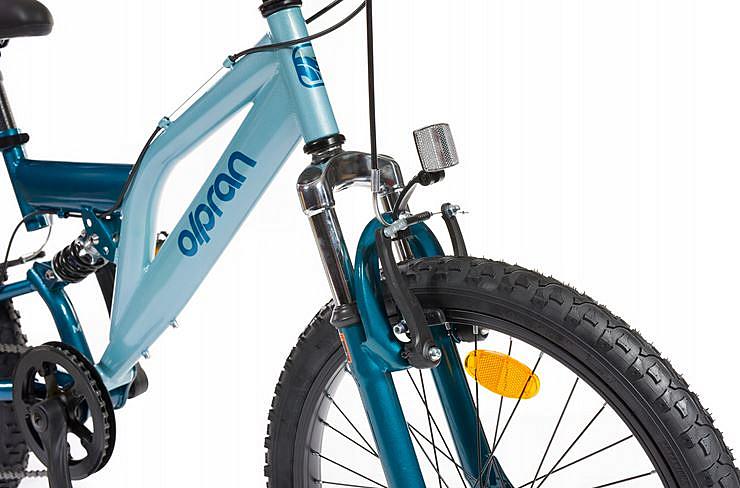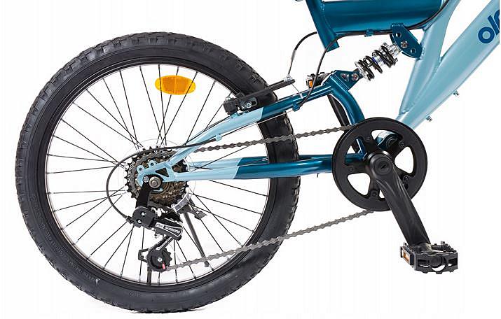 Dětské kolo Olpran s ocelovým 13palcovým rámem, odpruženou přední i zadní vidlicí a značkovými komponenty Shimano. Ráfkové brzdy a 6 převodů přehazovačka.