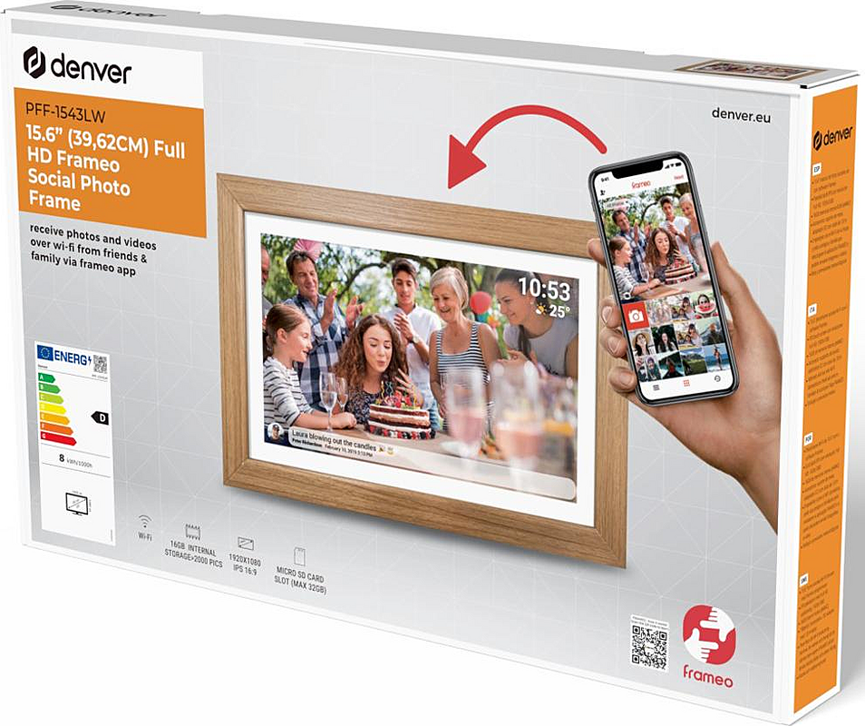 Digitální fotorámeček Denver s úhlopříčkou 15,6 palců, slotem na microSD kartu a funkcí časovače.