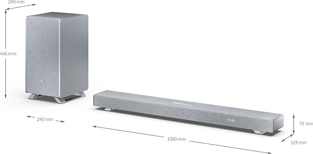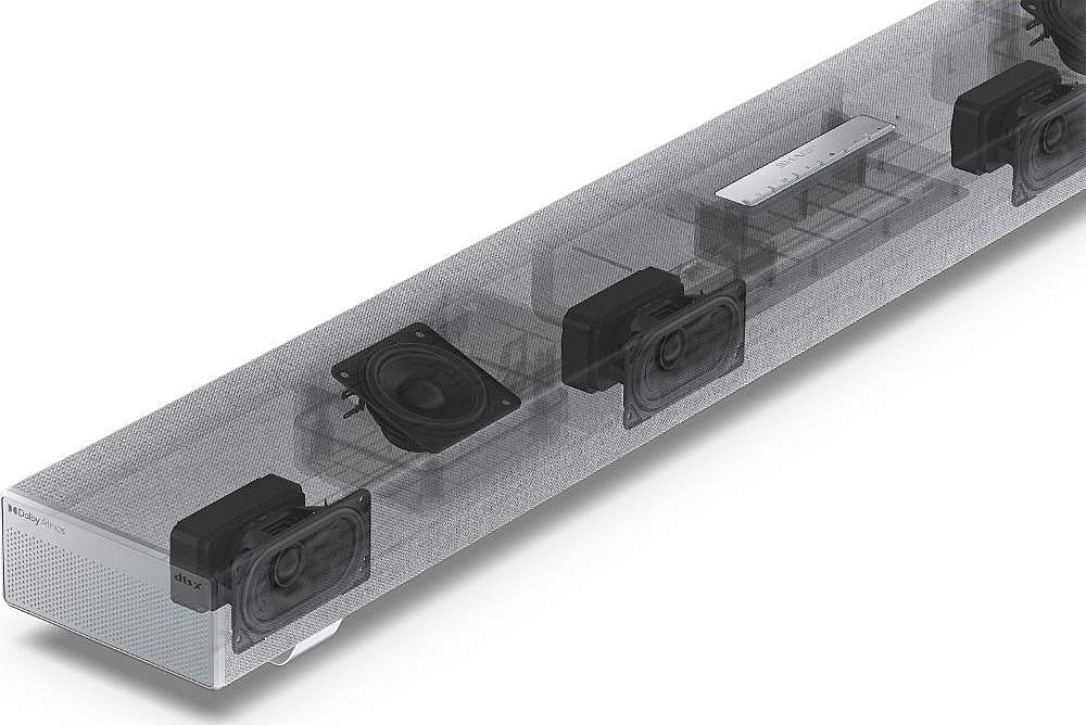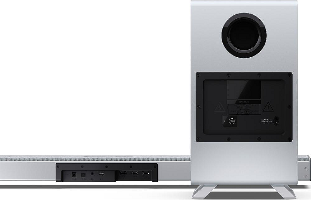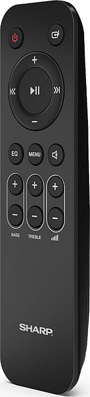 Soundbar Sharp s výkonem 550 W, USB připojením a možností umístění na zeď.