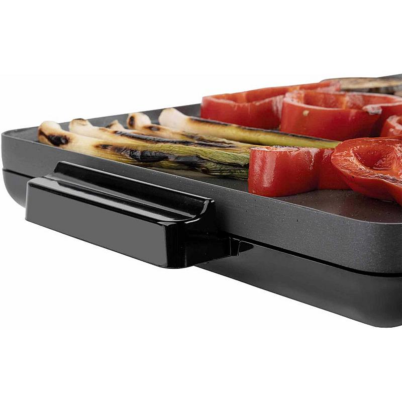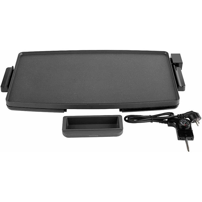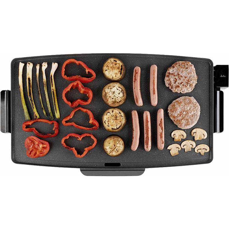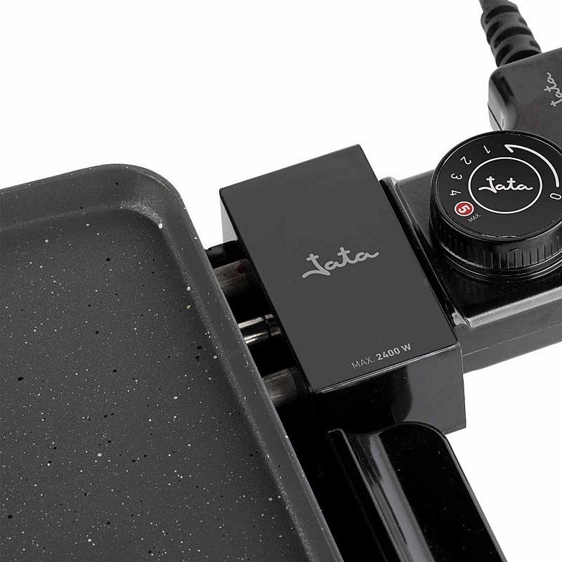 Stolní gril Jata a rovnoměrným ohříváním, nastavitelným a odnímatelným termostatem a sběrnou nádobou.