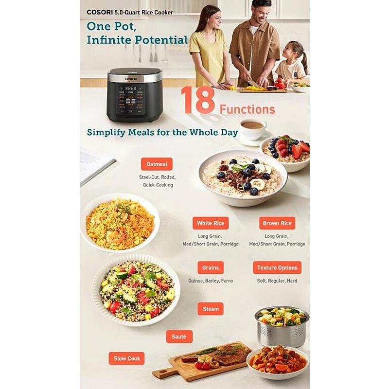 Multifunkční hrnec a rýžovar Cosori s objemem 5 l, 17 funkcemi a přehledným dotykovým ovládacím panelem.