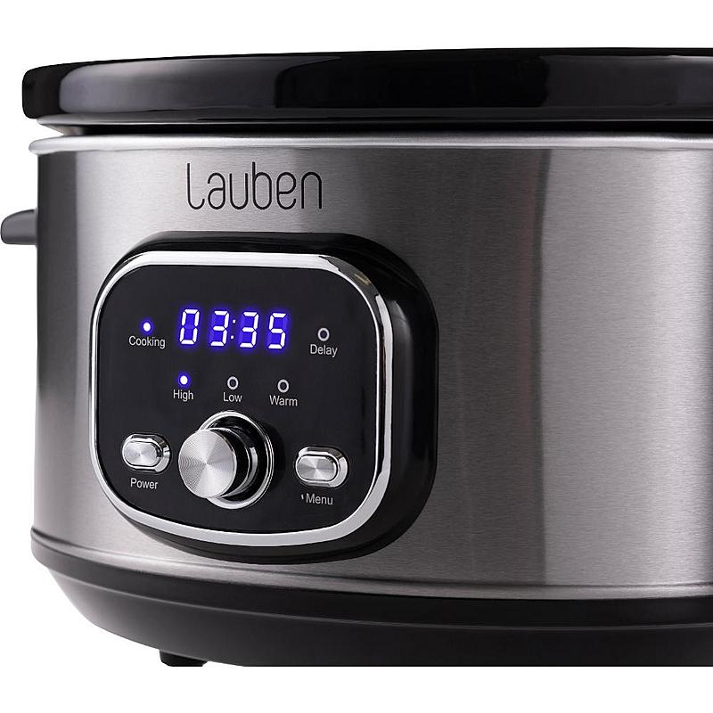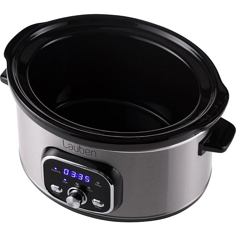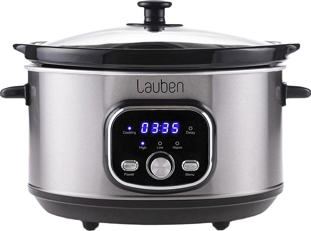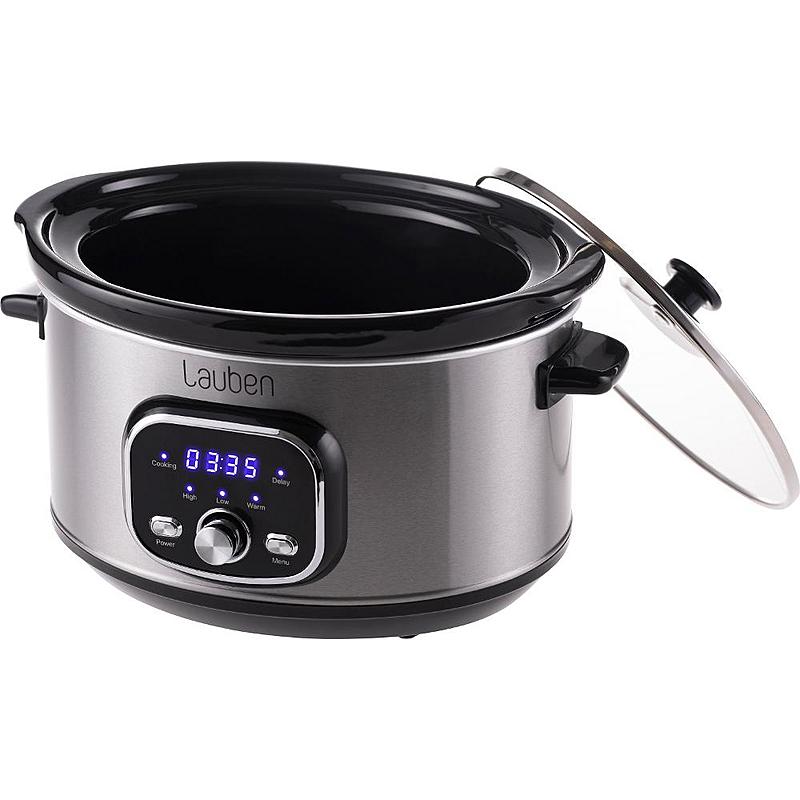 Multifunkční hrnec Lauben s objemem 3,5 l, keramickou nádobou, časovačem a poklicí z tvrzeného skla. Odložený start a udržení teploty.