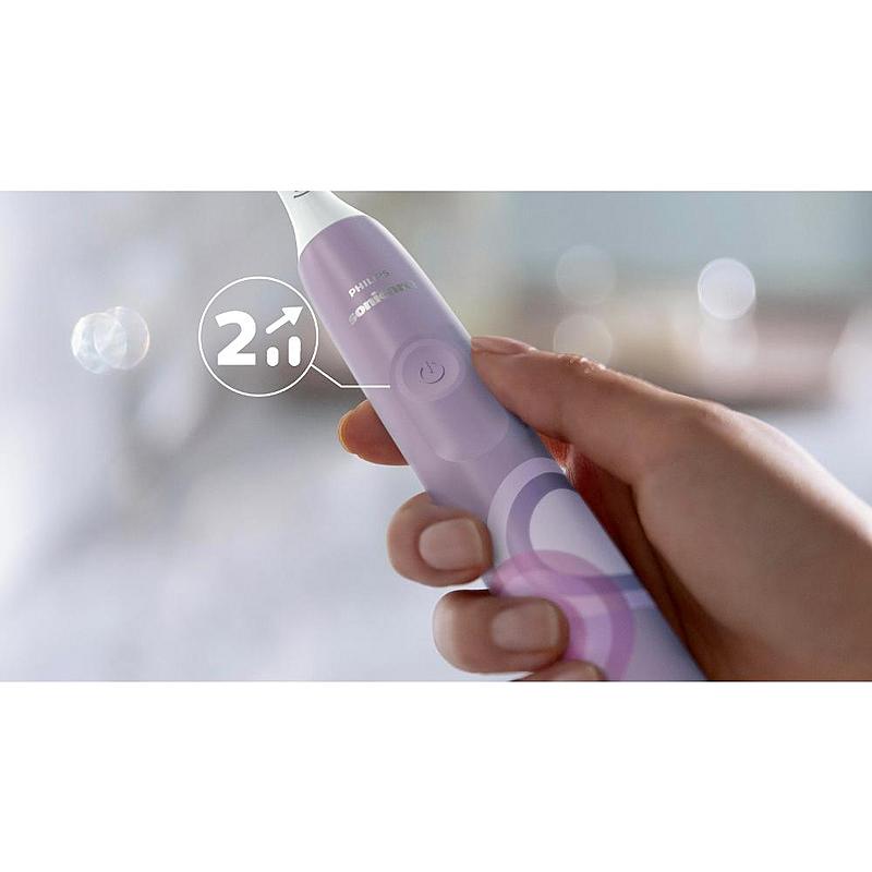 Sonický zubní kartáček Philips se dvěma stupni intenzity, indikací stavu baterie a nabíjecí základnou.