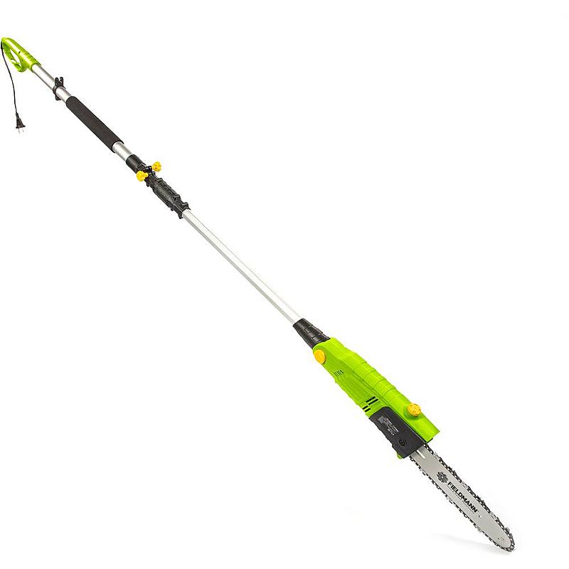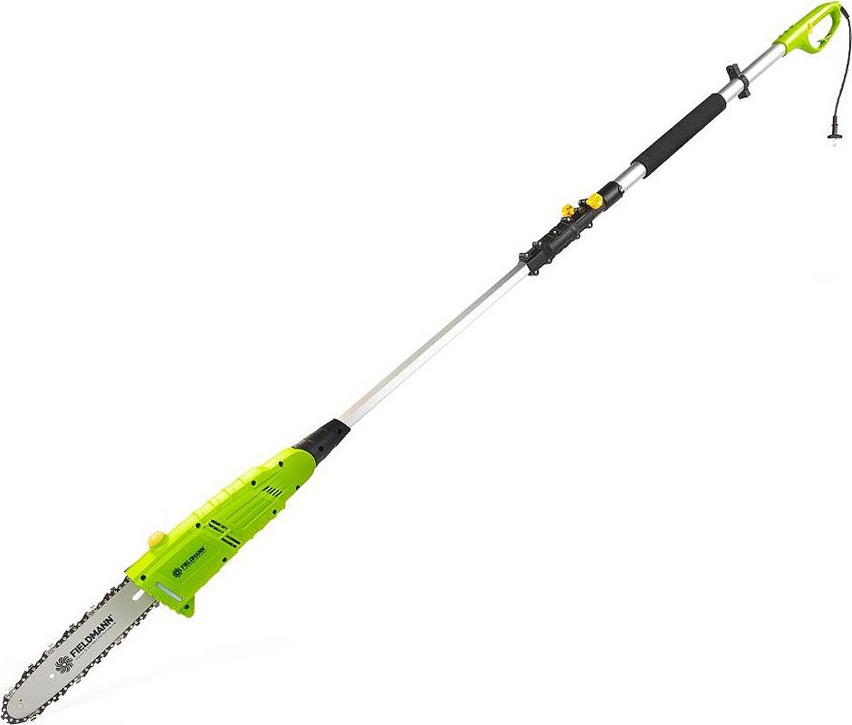 Teleskopický prořezávač Fieldmann s teleskopickou rukojetí a nastavitelným úhlem řetězové hlavy.