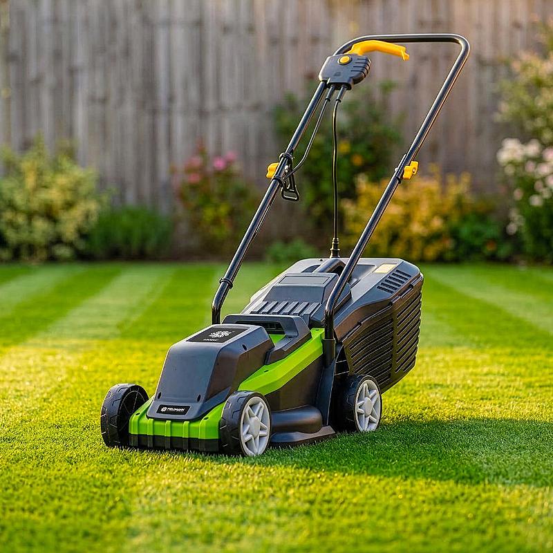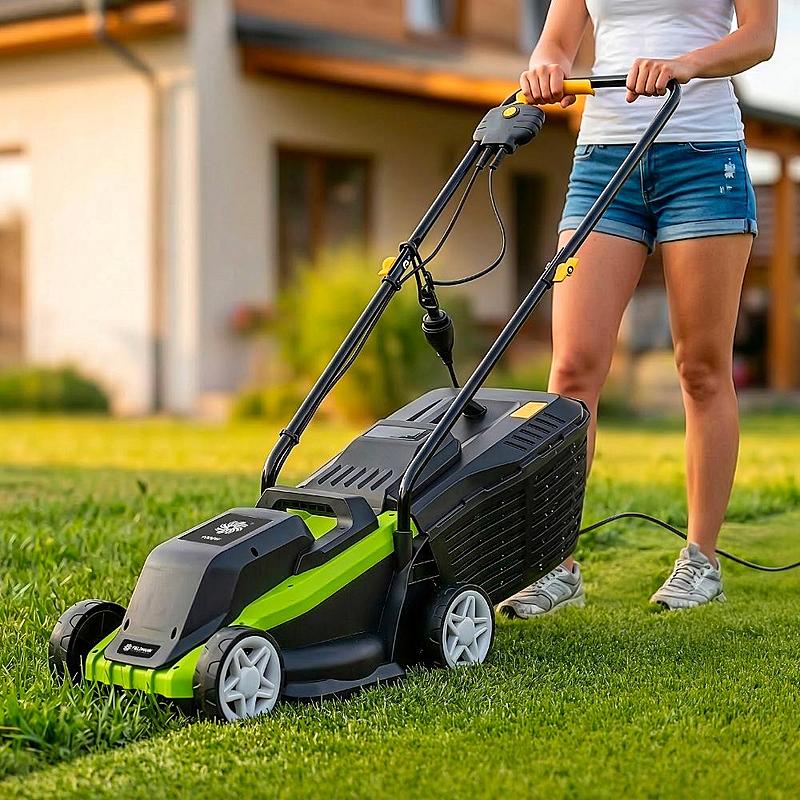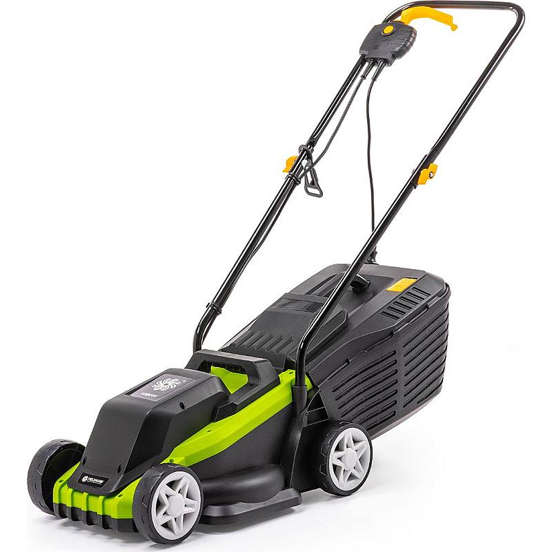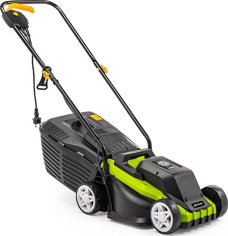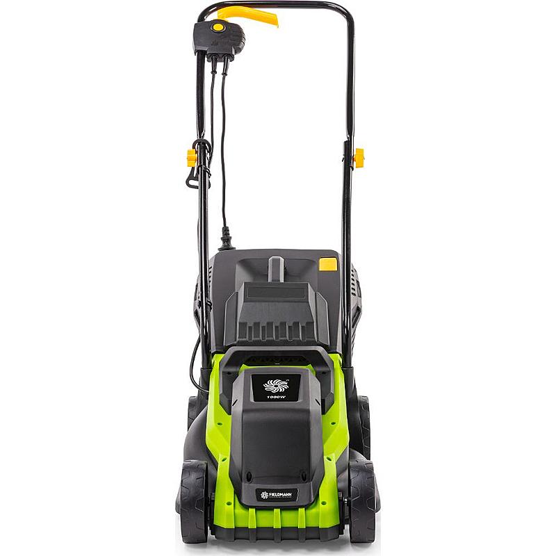 Elektrická rotační sekačka Fieldmann se třemi úrovněmi sečení, plastovým košem o objemu 30 l a ukazatelem zaplnění.