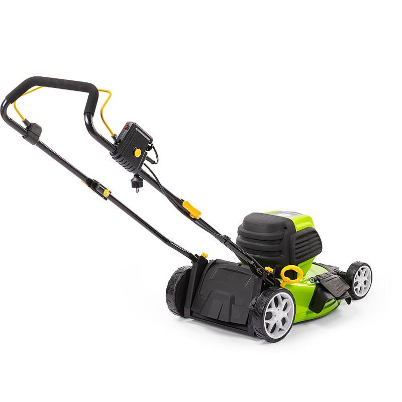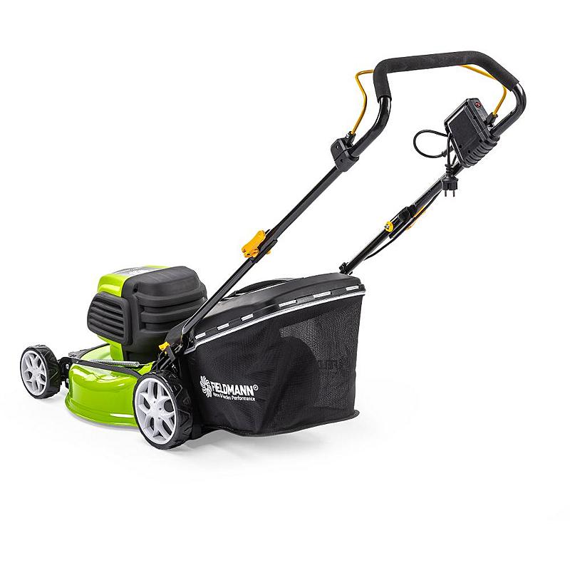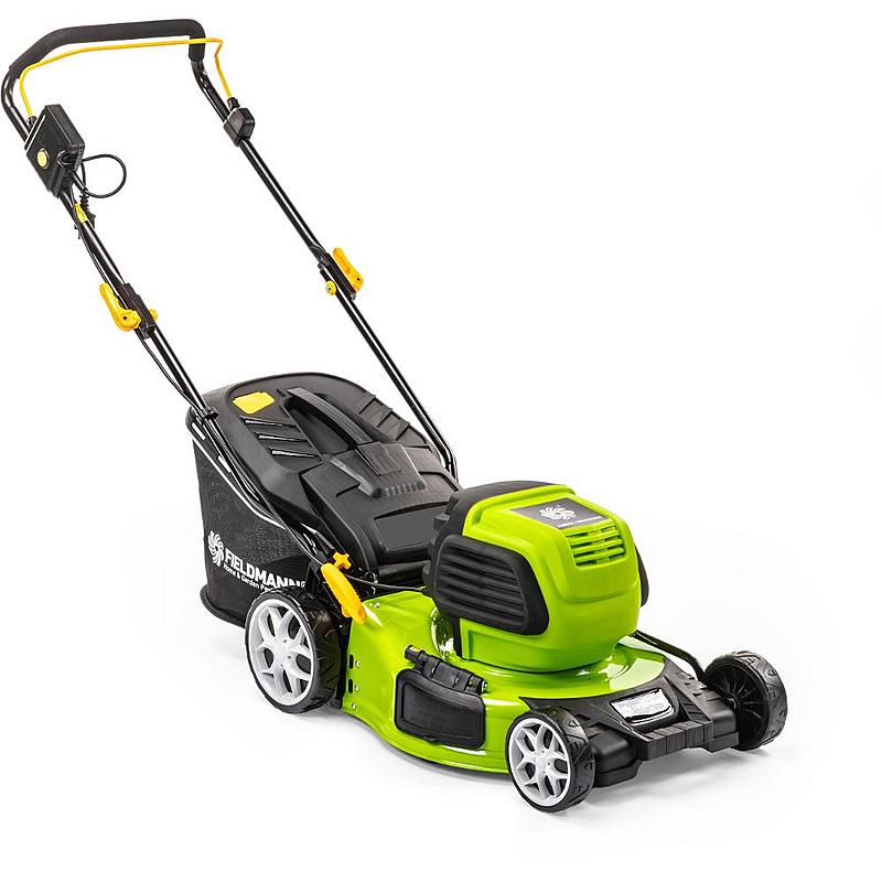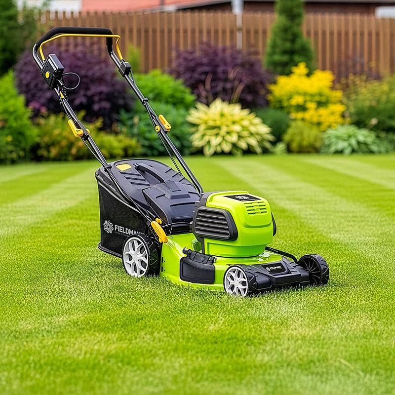 Zahradní rotační sekačka Fieldmann se záběrem sečení 46 cm, bezuhlíkovým motorem a možností nastavení výšky sečení.