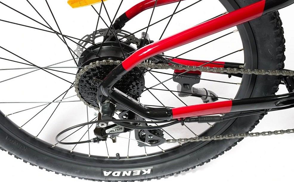 Dětské elektrokolo Olpran s lehkým hliníkovým rámem, odpruženou vidlicí a přehazovačkou Shimano. Velikost rámu 14 palců a dvoukomorové hliníkové ráfky.