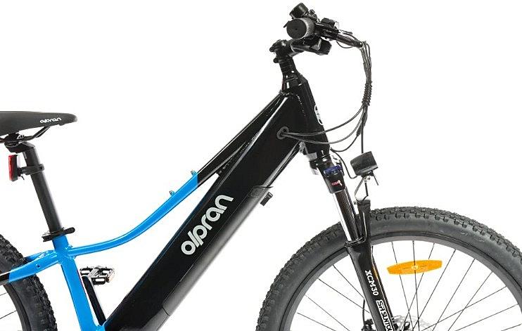 Dětské elektrokolo Olpran s lehkým hliníkovým rámem, odpruženou vidlicí a přehazovačkou Shimano. Velikost rámu 14 palců a dvoukomorové hliníkové ráfky.