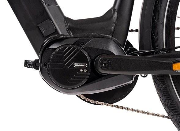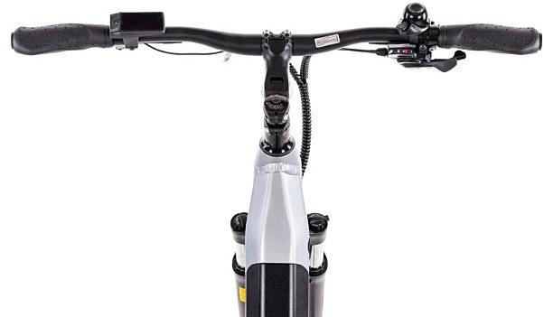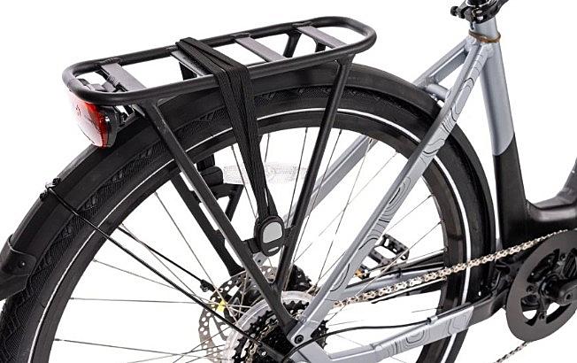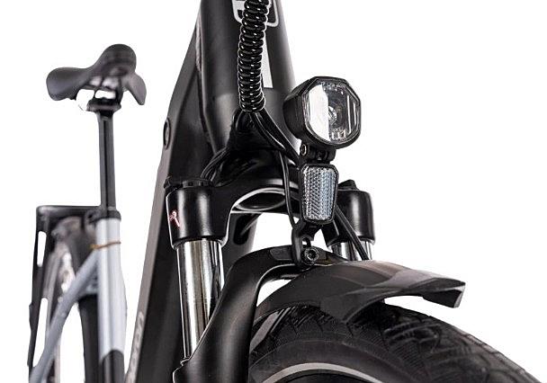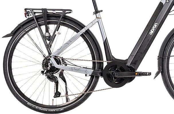 Městské elektrokolo Olpran s hliníkovým rámem, výkonným středovým motorem, odpruženou přední vidlicí a zadním nosičem. Velikost kol 28 palců a velikost rámu 17 palců.