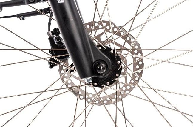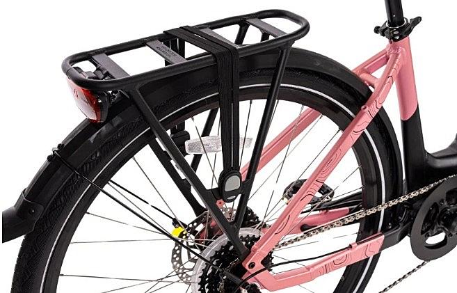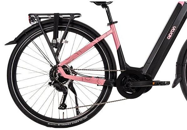 Městské elektrokolo Olpran s hliníkovým rámem, výkonným středovým motorem, odpruženou přední vidlicí a zadním nosičem. Velikost kol 28 palců a velikost rámu 17 palců.