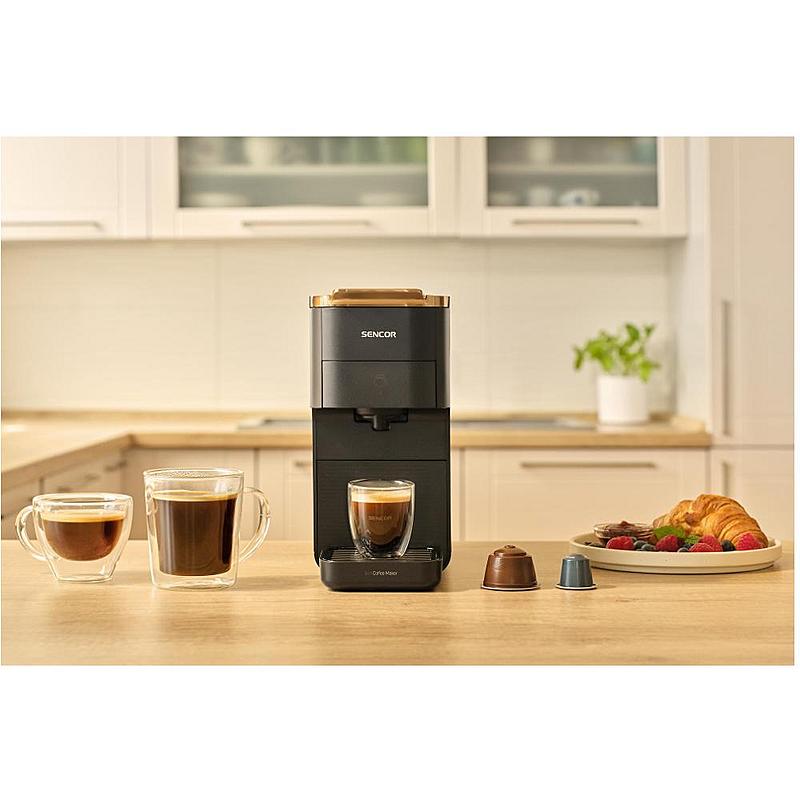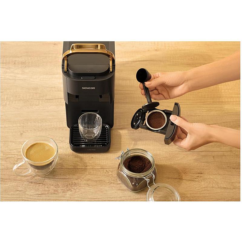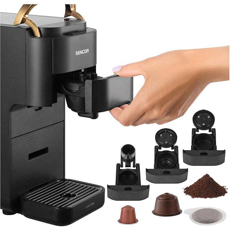 Multikapslový kávovar Sencor 3 v 1 kompatibilní s kapslemi Nespresso®, NESCAFÉ Dolce Gusto, pody E.S.E. nebo 7 g mleté kávy.