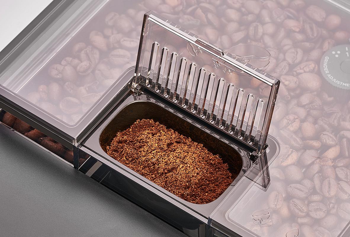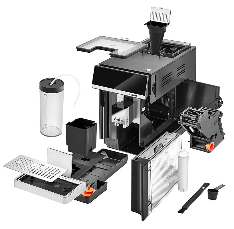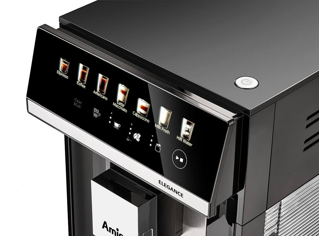 Automatický kávovar Amica s přednastavenými programy, samočištěním a funkcí horké vody. Mléčný systém a nastavení teploty kávy.