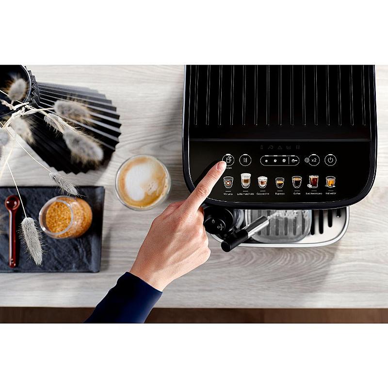 Automatický kávovar De’Longhi s intuitivním dotykovým ovládacím panelem, možností nastavení hrubosti mletí a vyjímatelnou spařovací jednotkou pro snadnou údržbu.
