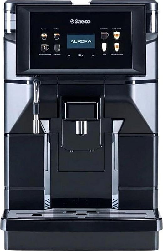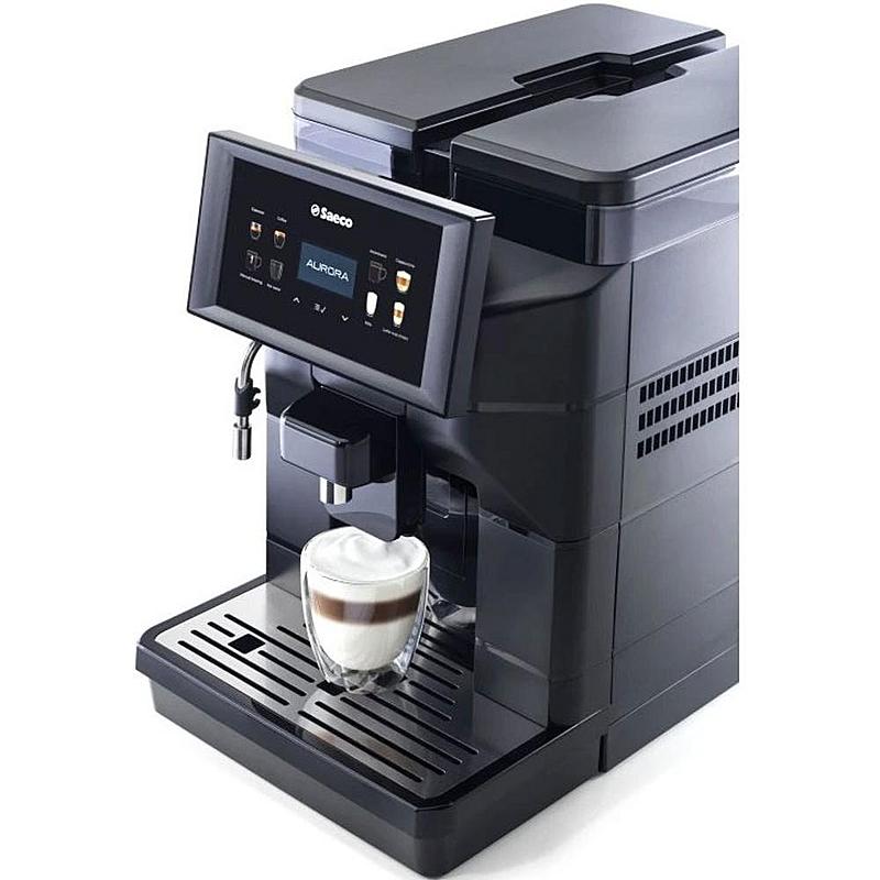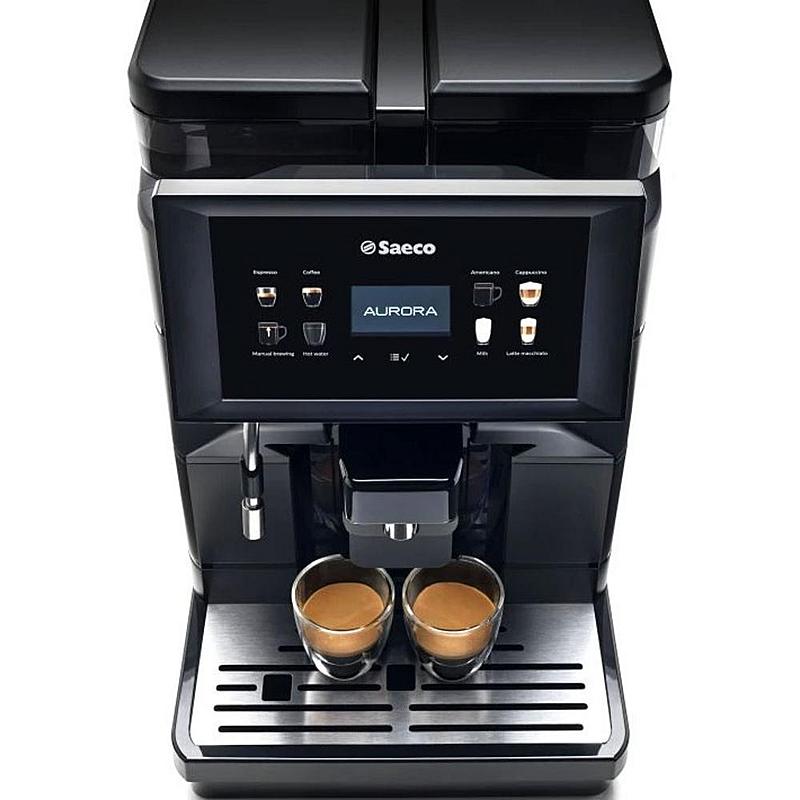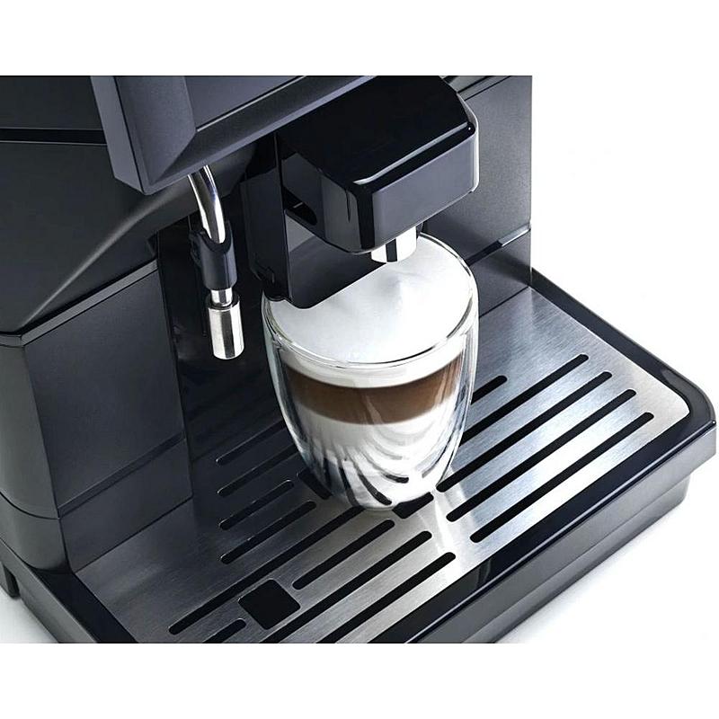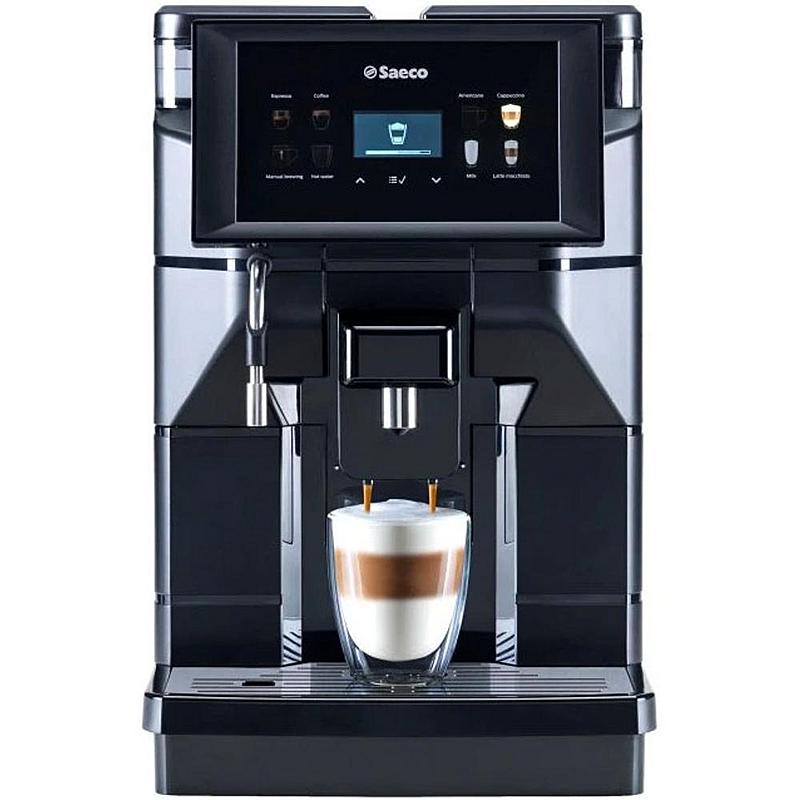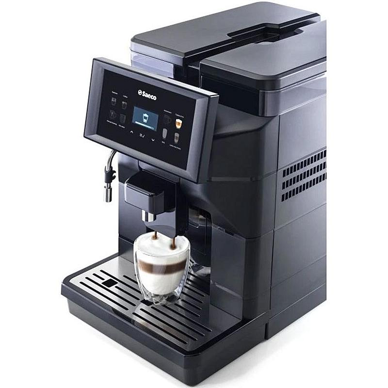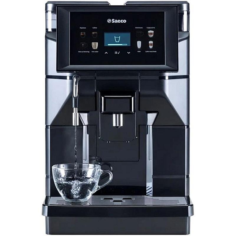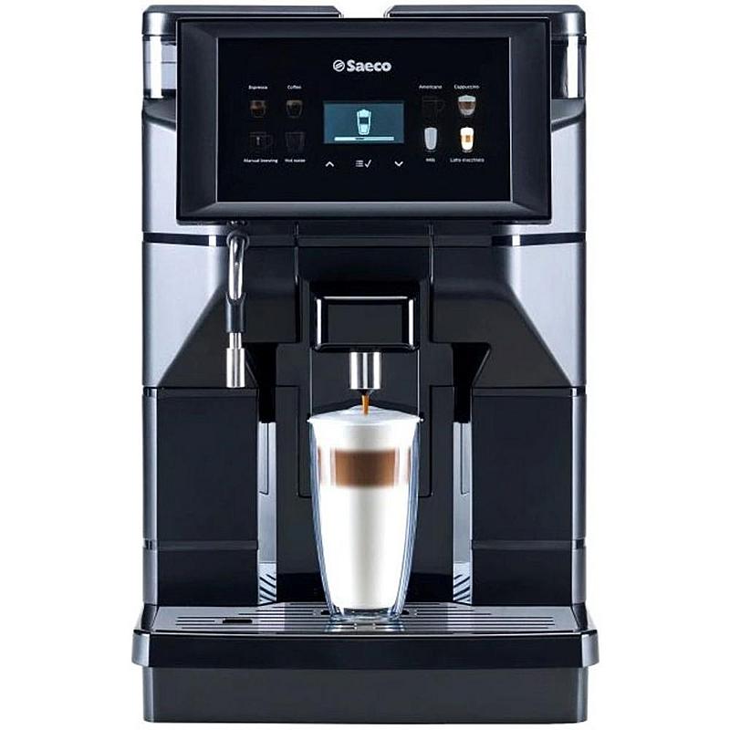 Automatický kávovar Saeco s displejem s dotykovými tlačítky a fotorealistickými nápojovými ikonami. Kónický ocelový mlýnek, nastavení hrubosti mletí a funkce předspaření.