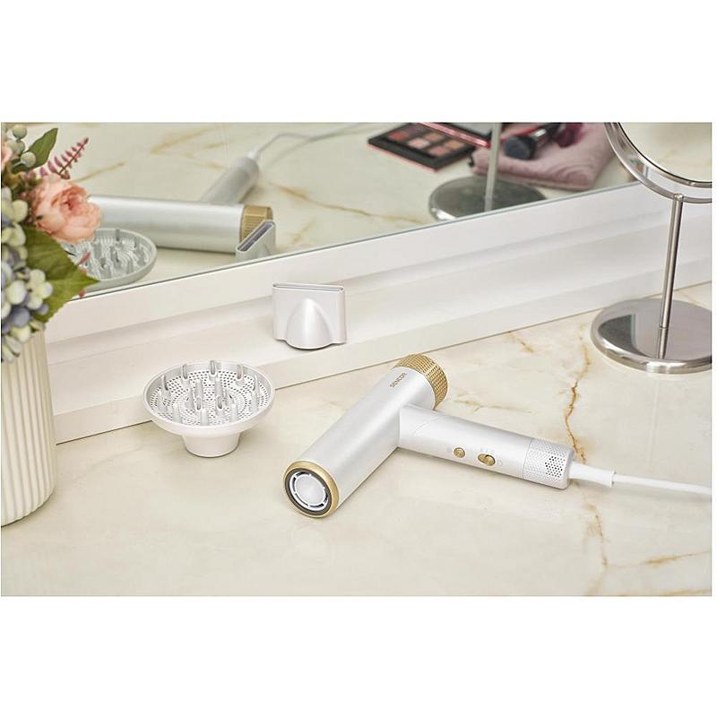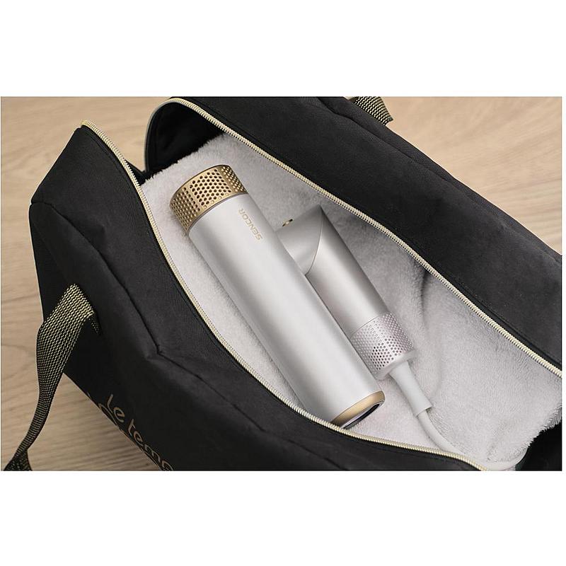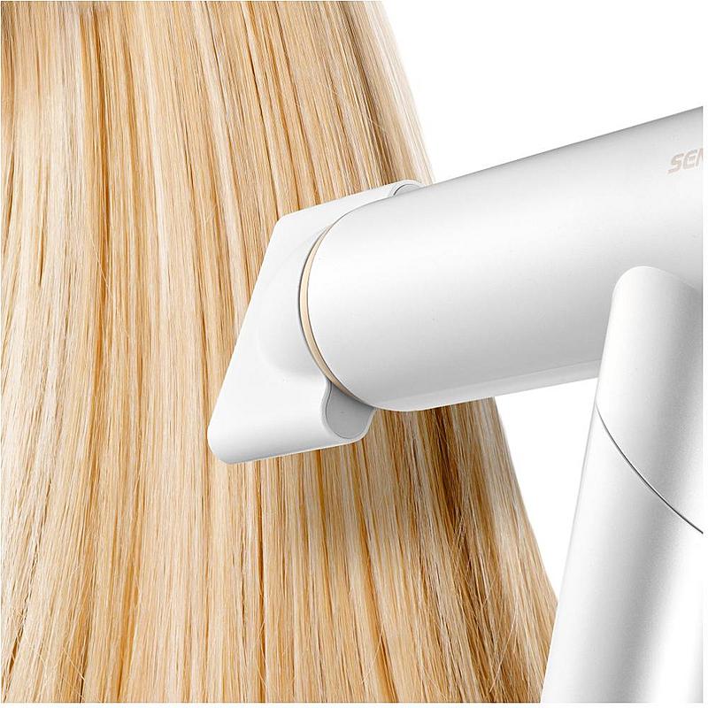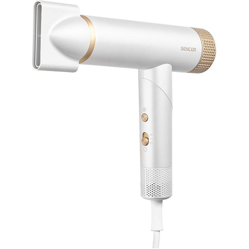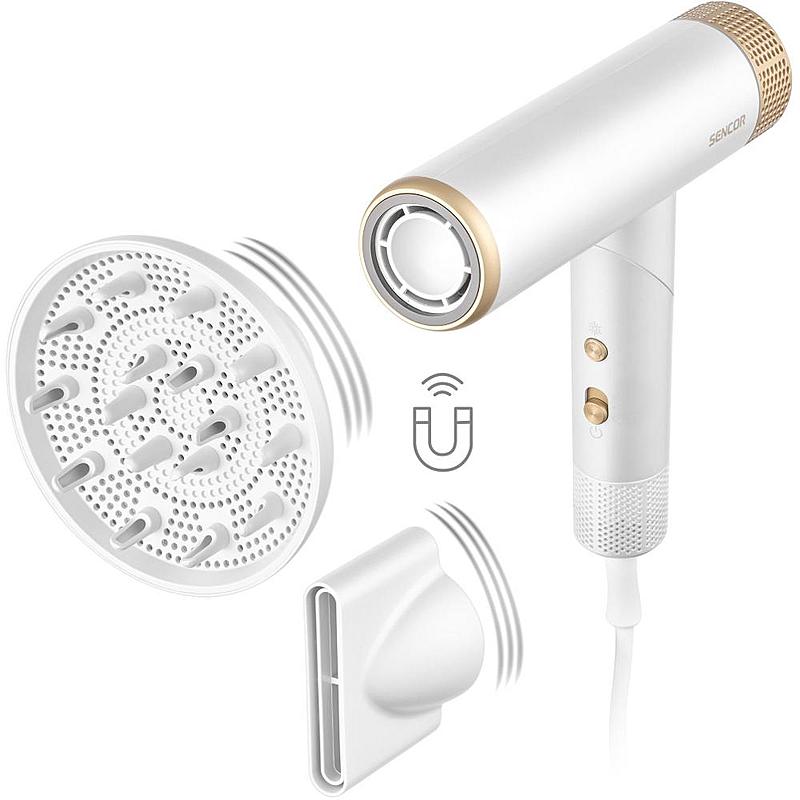 Fén na vlasy Sencor s BLDC motorem, regulací teploty se čtyřmi stupni a ionizační funkcí. Skládací rukojeť a funkce studeného vzduchu.