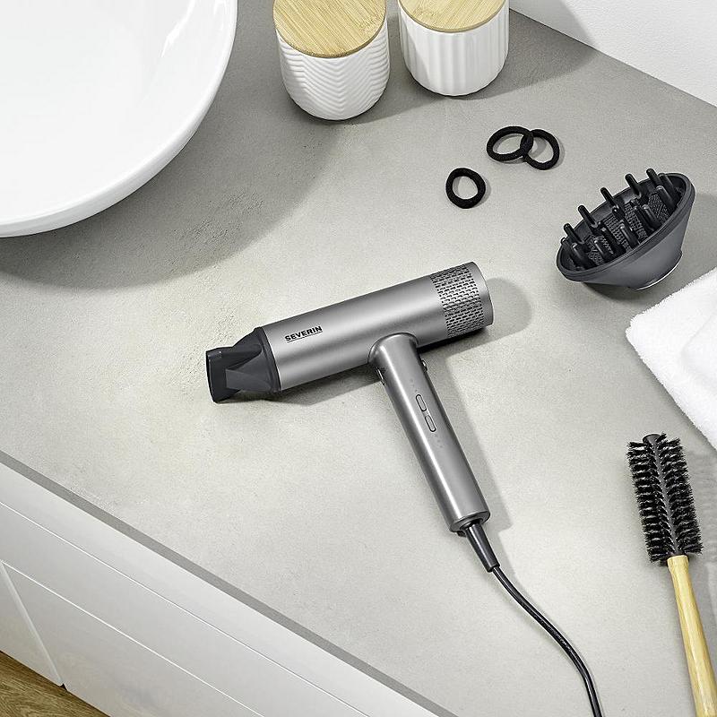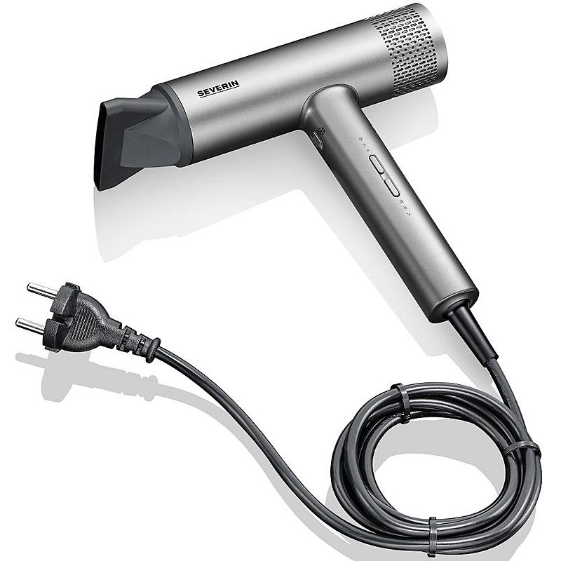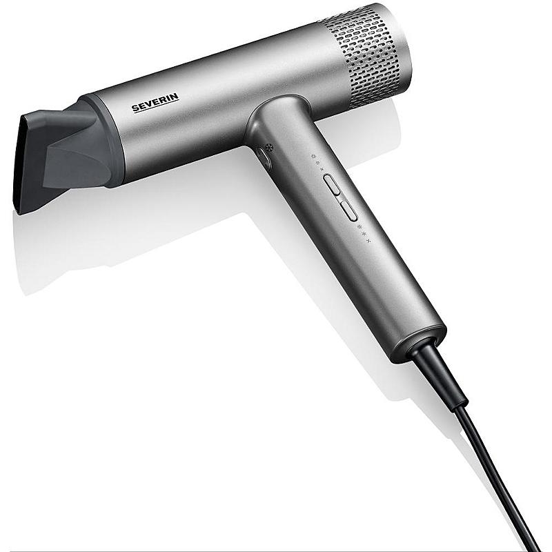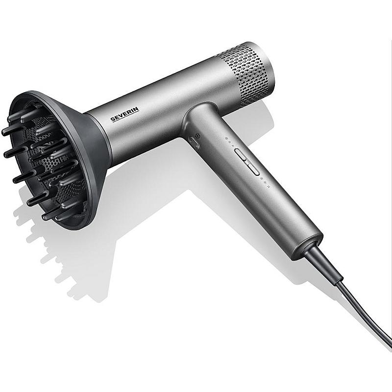 Fén na vlasy Severin s vyjímatelným filtrem, difuzérem, tvarovací koncovkou a výkonným BLDC motorem.