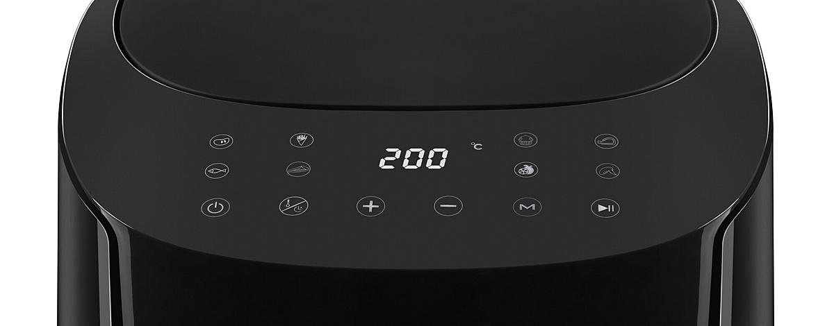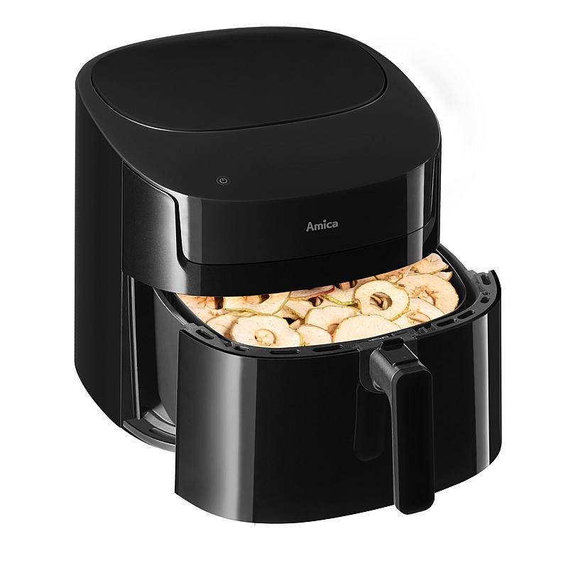 Horkovzdušná fritéza Amica s časovačem, 8 přednastavenými programy a funkcí sušení a rozmrazování. Objem 6,2 l, regulace teploty a automatické vypnutí.