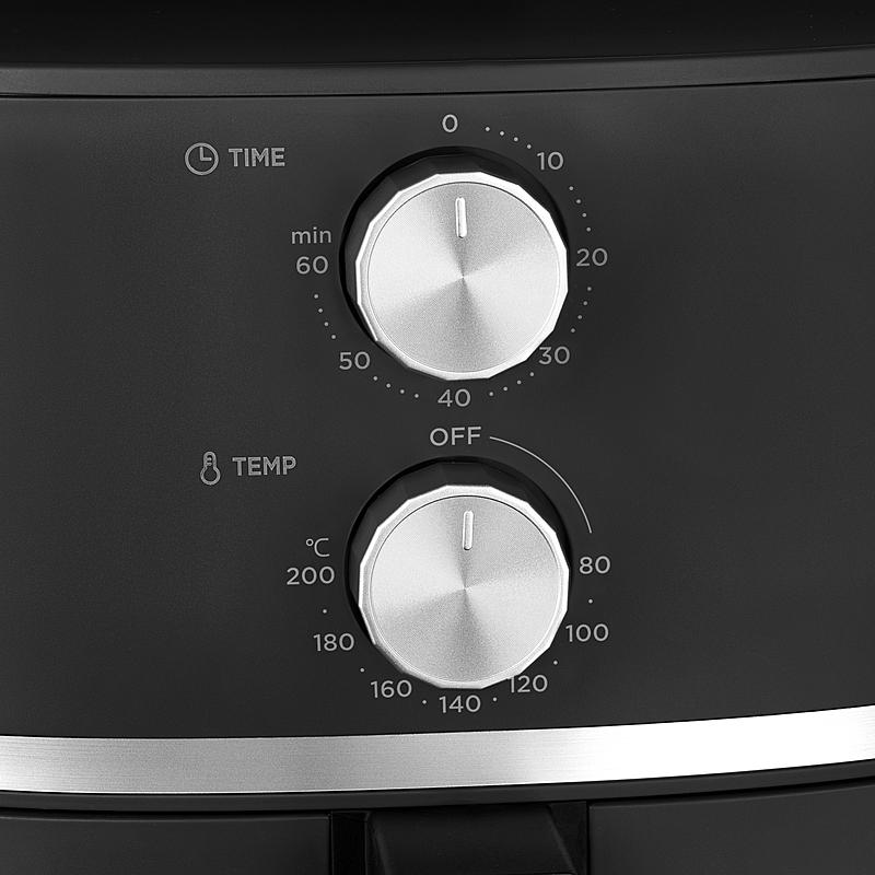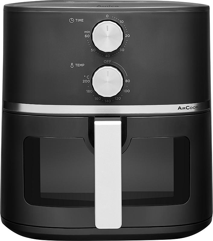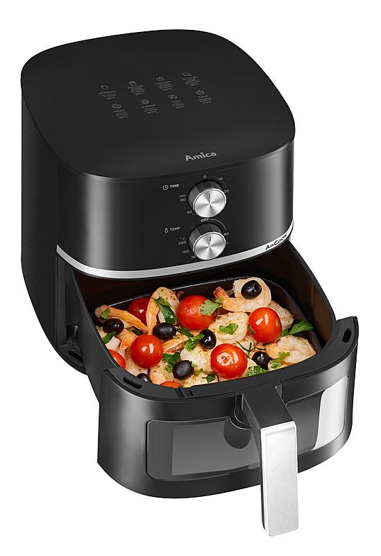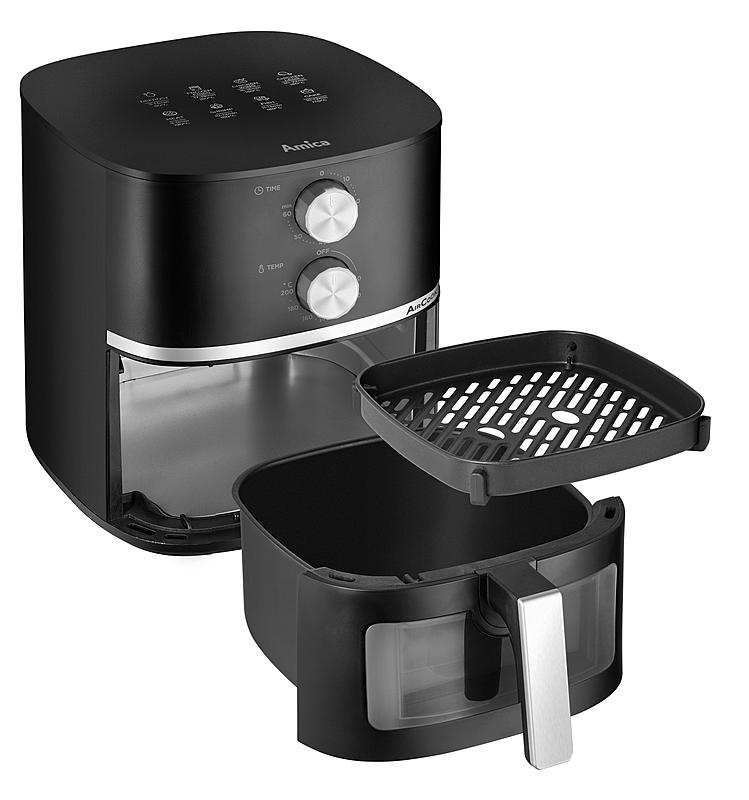 Horkovzdušná fritéza Amica s časovačem, 8 přednastavenými programy a objemem koše 5 l. Funkce automatického vypnutí a regulace teploty.