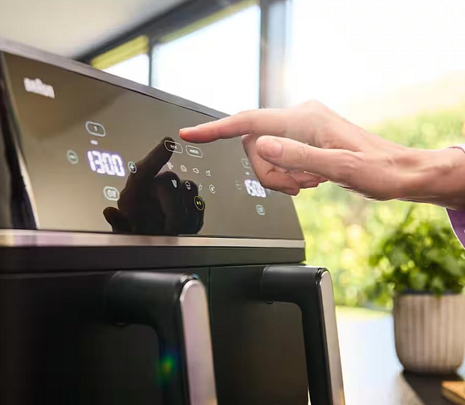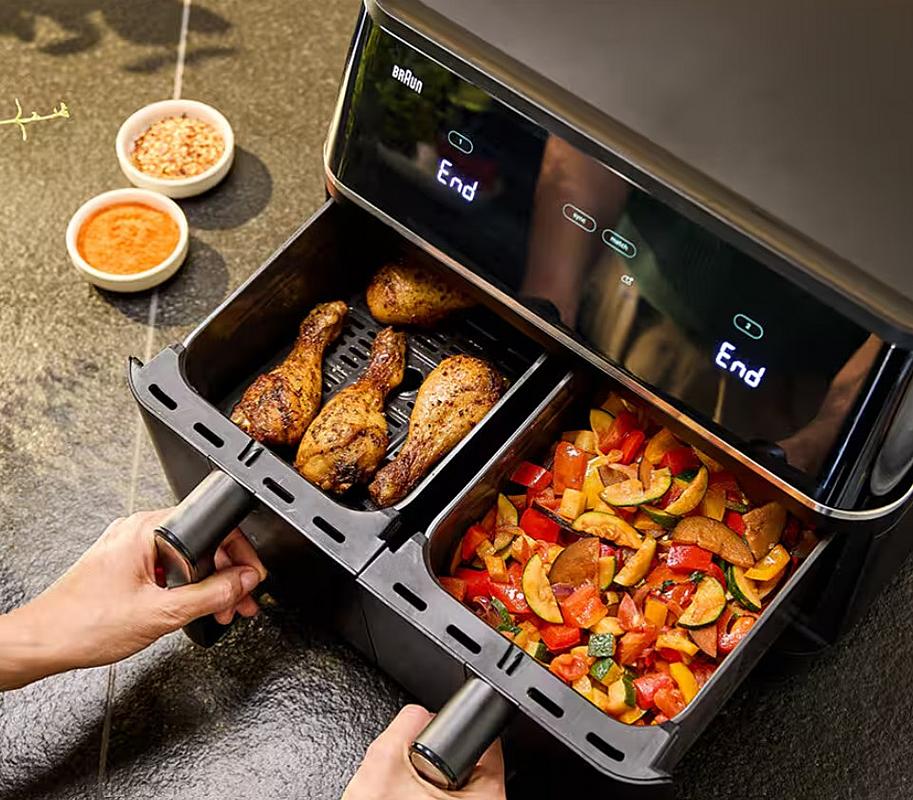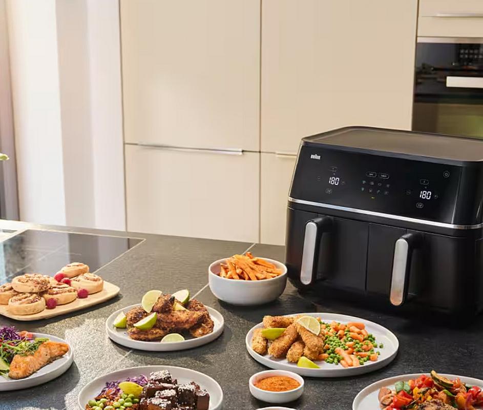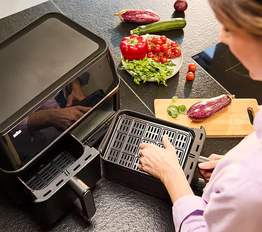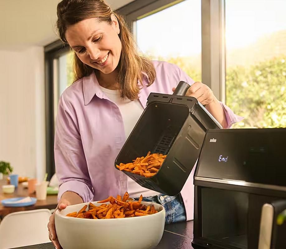 Horkovzdušná fritéza Braun s duálním košem, celkovým objemem 10 l, časovačem a 8 programy.