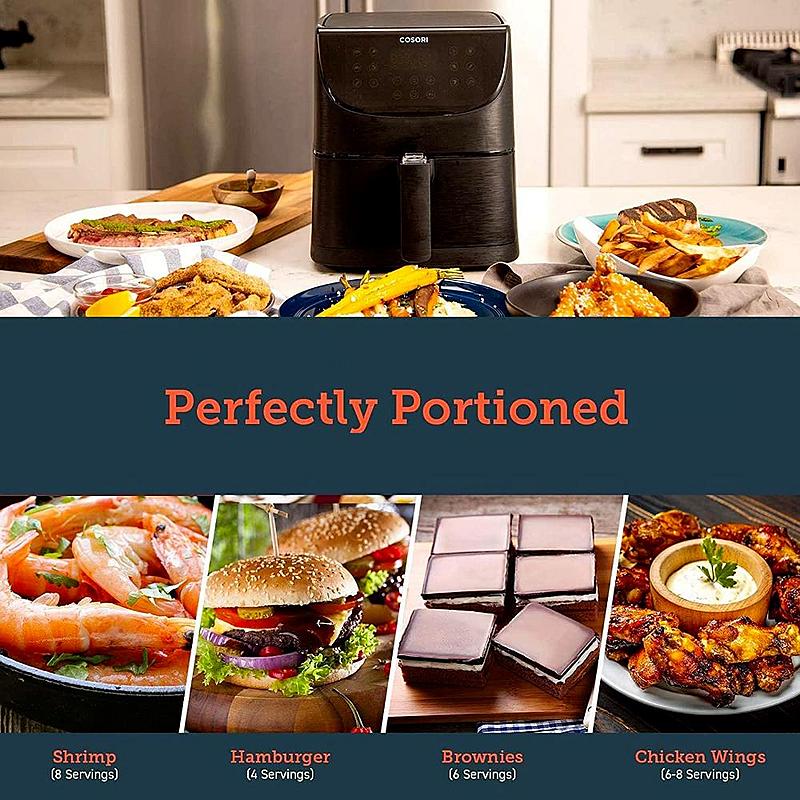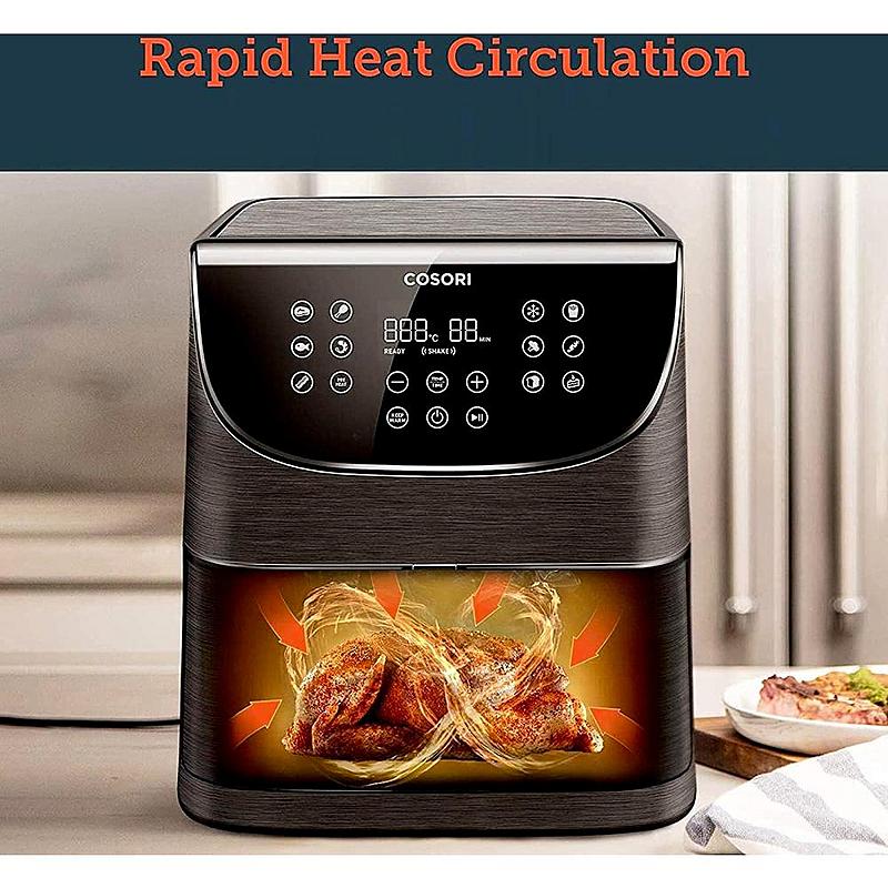 Horkovzdušná fritéza Cosori s objemem koše 5,5 l, časovačem, 11 programy a jehlami na špízy.