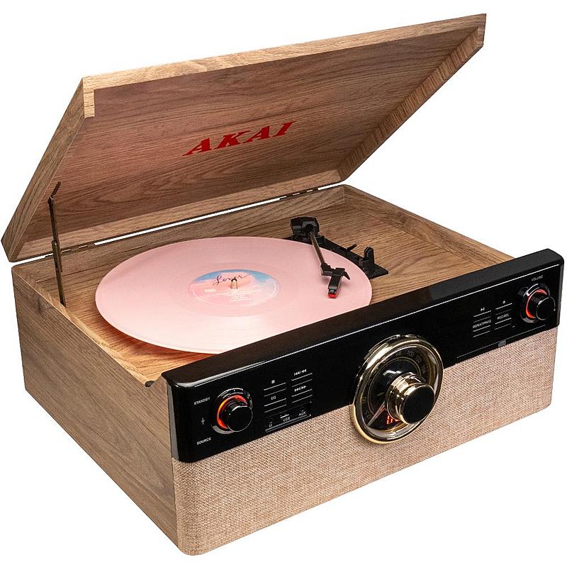 Gramofon Akai s výkonem 18 W, FM analogovým tunerem a možností přehrávání přes USB.