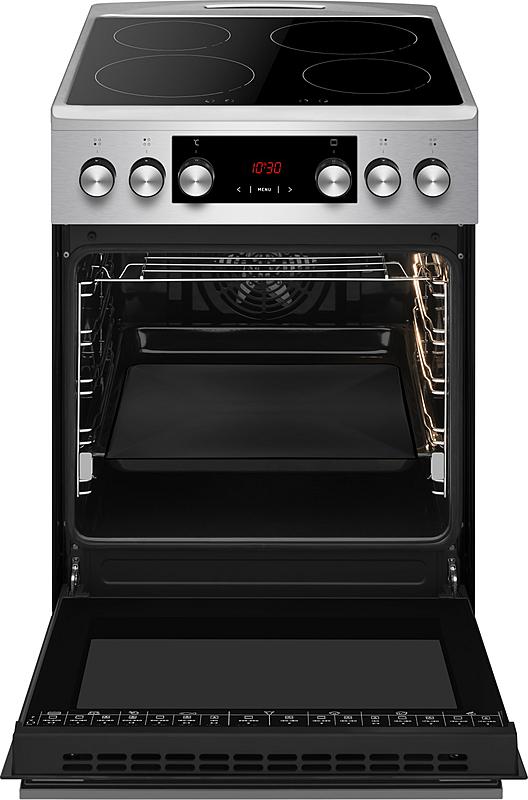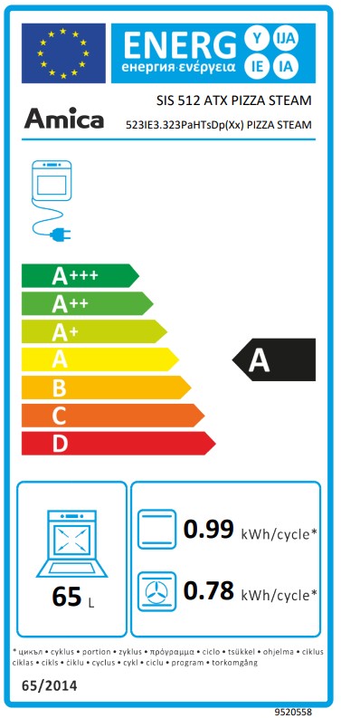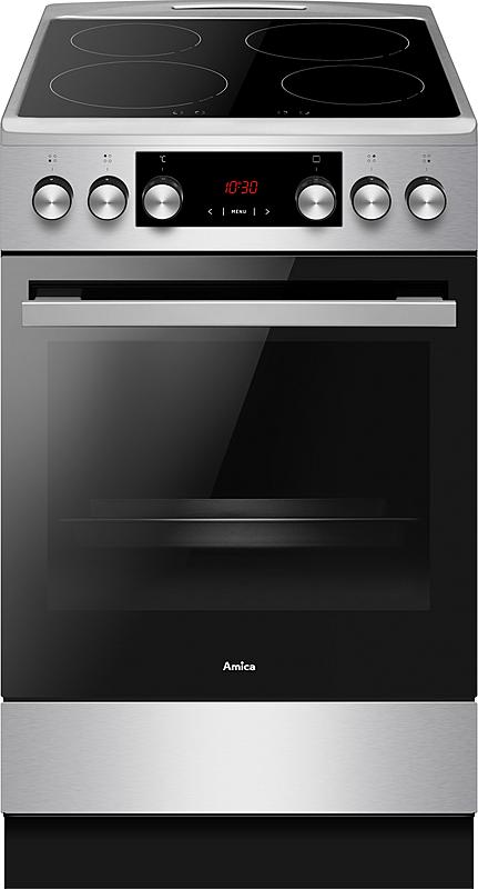 Indukční sporák Amica s funkcí parního čištění, 12 funkcemi a indikátorem zbytkového tepla. Energetická třída A, objem 65 l a funkce Pizza.