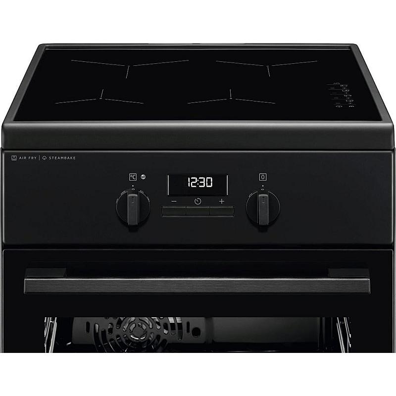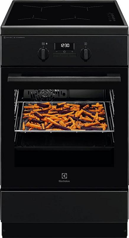 Indukční sporák Electrolux s horkovzdušnou troubou, grilem a funkcí pro zdravé fritování. Energetická třída A a katalytický povrch pro snadné čištění trouby.