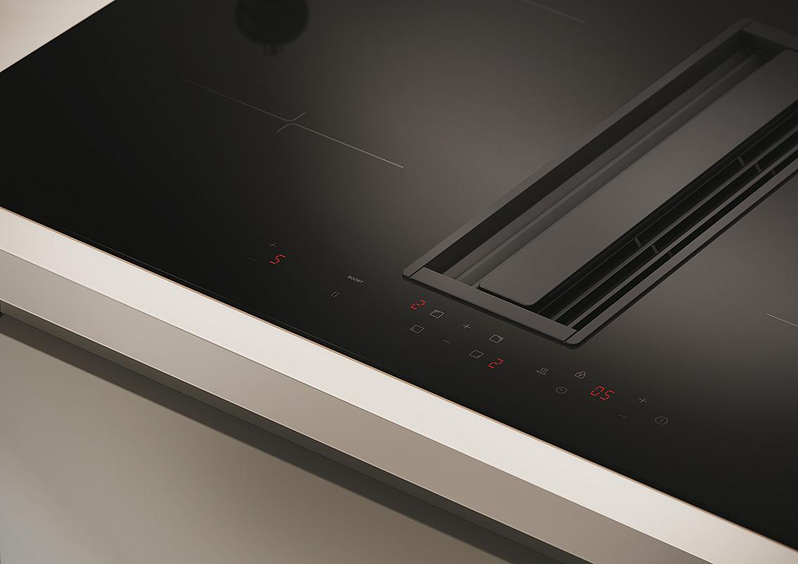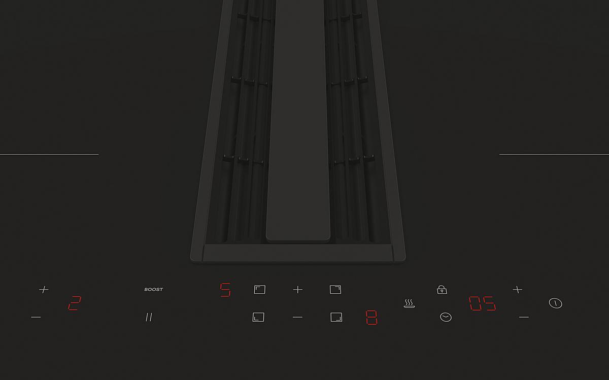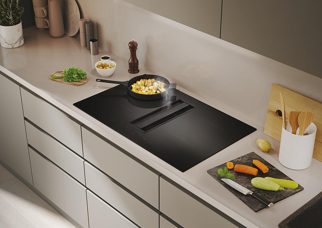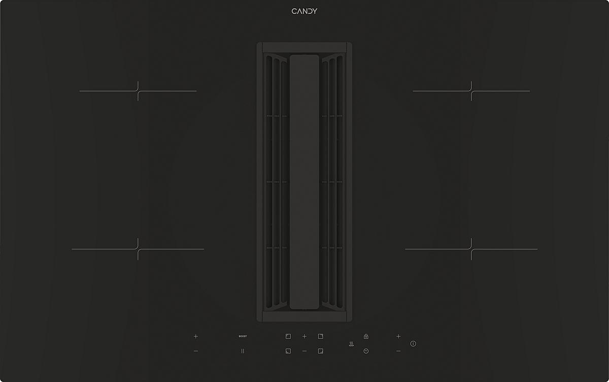 Indukční varná deska Candy s odsavačem par, intuitivním centrálním ovládáním a funkcí udržování teploty. Časovač a Power Management.