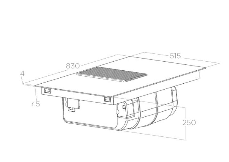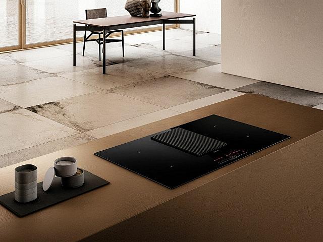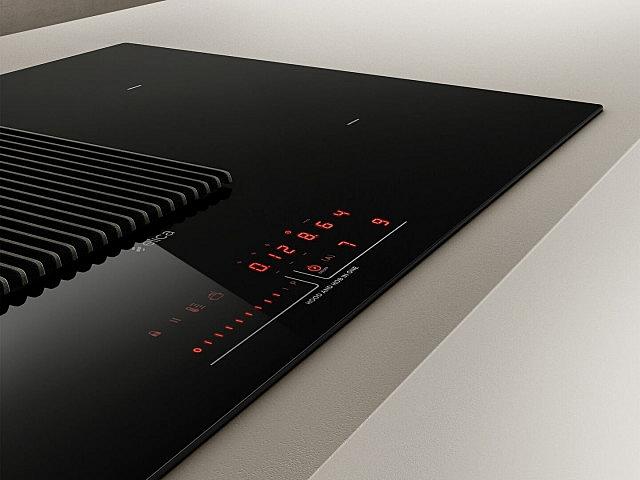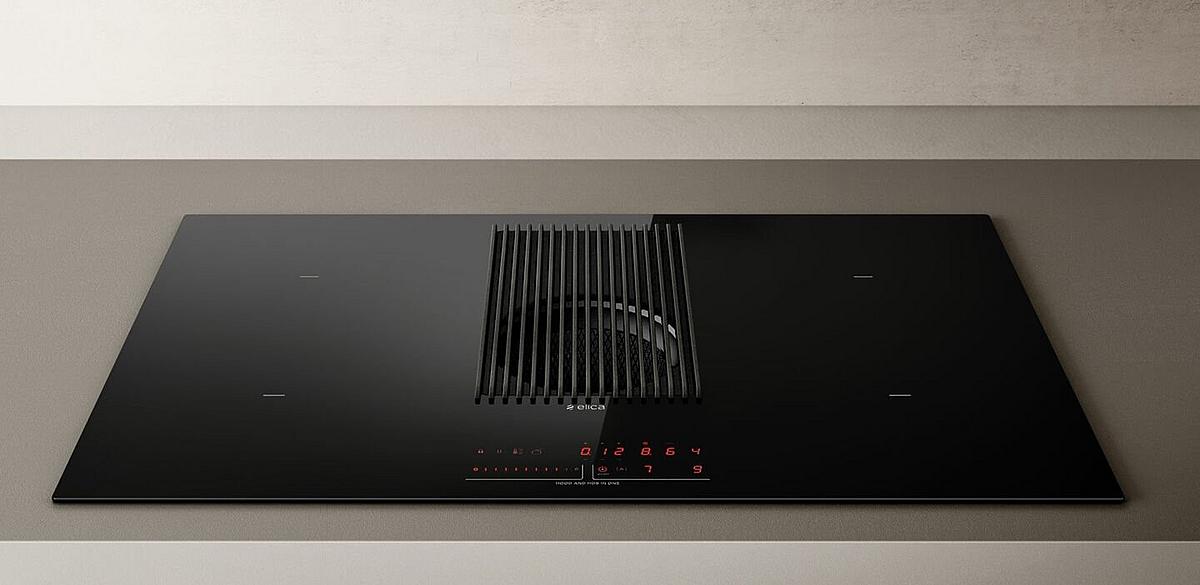 Indukční varná deska Elica s integrovaným odsavačem par. 4 varné zóny, systém odtahu i recirkulace a ukazatel zbytkového tepla.
